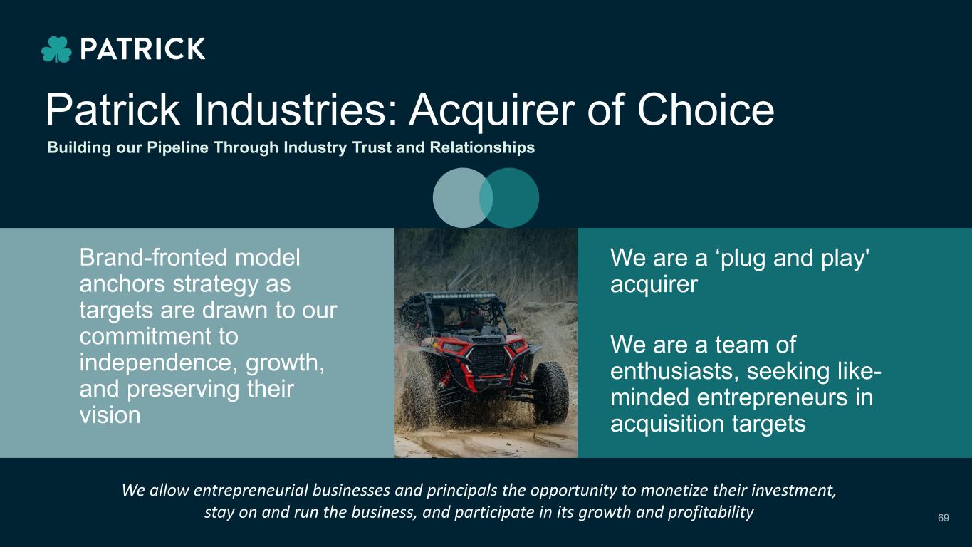 Patrick Industries: Acquirer of Choice Brand-fronted model anchors strategy as targets are drawn to our commitment to independence, growth, and preserving their vision Building our Pipeline Through Industry Trust and Relationships We are a ‘plug and play' acquirer We are a team of enthusiasts, seeking like- minded entrepreneurs in acquisition targets 69 We allow entrepreneurial businesses and principals the opportunity to monetize their investment, stay on and run the business, and participate in its growth and profitability