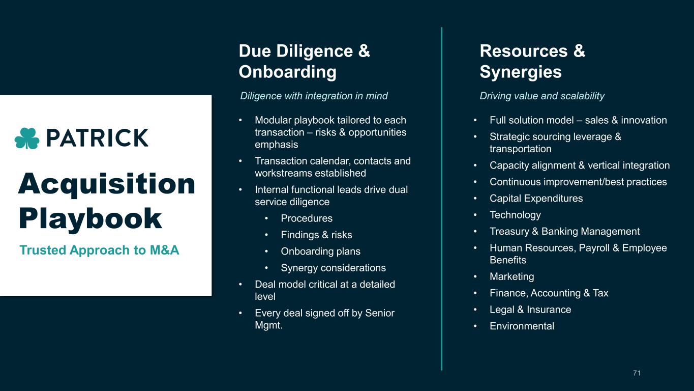 M&A Process is Metrics Driven And Values Based  Strong management team & cultural fit  Successful business model  Innovative product lines  Strong customer relationships  Accretive margin profile  Valuation (standard EBITDA range):  RV: 5.0 – 6.5x  Marine/Powersports: 6.0 – 7.5x Metric & Value Driven  Margin accretion within the first year  Synergies:  Within 12 – 18 months of close, we expect a 1 turn improvement on an acquisition’s EBITDA multiple  Succession planning  Management team will continue to run the business effectively and strengthen customer relationships  Develop & communicate best practices across the enterprise  Do not “fix” what isn’t broken Delivery Expectations 70
