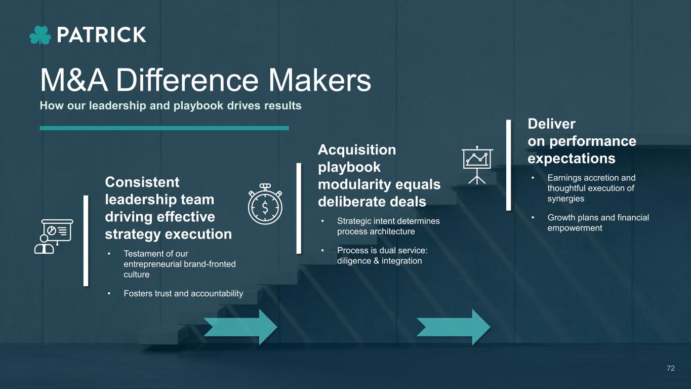 71 Acquisition Playbook Trusted Approach to M&A Due Diligence & Onboarding Resources & Synergies • Modular playbook tailored to each transaction – risks & opportunities emphasis • Transaction calendar, contacts and workstreams established • Internal functional leads drive dual service diligence • Procedures • Findings & risks • Onboarding plans • Synergy considerations • Deal model critical at a detailed level • Every deal signed off by Senior Mgmt. • Full solution model – sales & innovation • Strategic sourcing leverage & transportation • Capacity alignment & vertical integration • Continuous improvement/best practices • Capital Expenditures • Technology • Treasury & Banking Management • Human Resources, Payroll & Employee Benefits • Marketing • Finance, Accounting & Tax • Legal & Insurance • Environmental Diligence with integration in mind Driving value and scalability