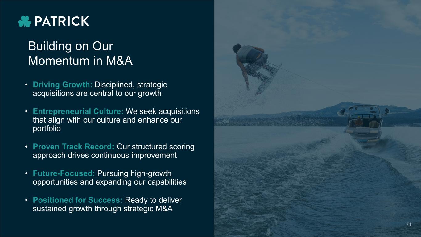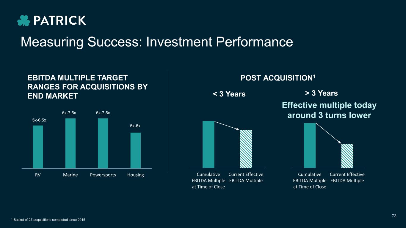 Measuring Success: Investment Performance Aftermarket RV Marine Powersports Housing 6x-7.5x 5x-6.5x 6x-7.5x 5x-6x EBITDA MULTIPLE TARGET RANGES FOR ACQUISITIONS BY END MARKET < 3 Years > 3 Years Cumulative EBITDA Multiple at Time of Close Current Effective EBITDA Multiple Cumulative EBITDA Multiple at Time of Close Current Effective EBITDA Multiple Effective multiple today around 3 turns lower 1 Basket of 27 acquisitions completed since 2015 POST ACQUISITION1 73