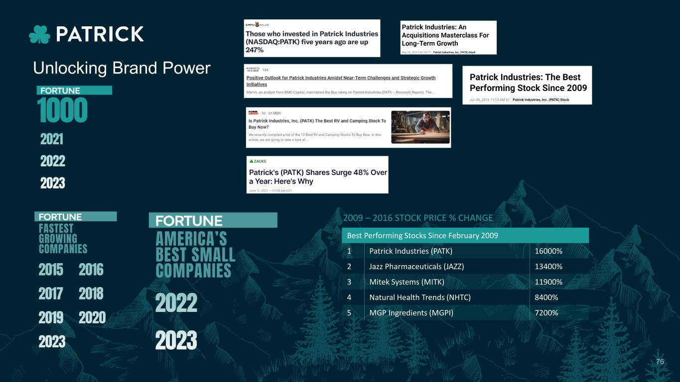 Unlocking Brand Power 2009 – 2016 STOCK PRICE % CHANGE Best Performing Stocks Since February 2009 1 Patrick Industries (PATK) 16000% 2 Jazz Pharmaceuticals (JAZZ) 13400% 3 Mitek Systems (MITK) 11900% 4 Natural Health Trends (NHTC) 8400% 5 MGP Ingredients (MGPI) 7200% 76