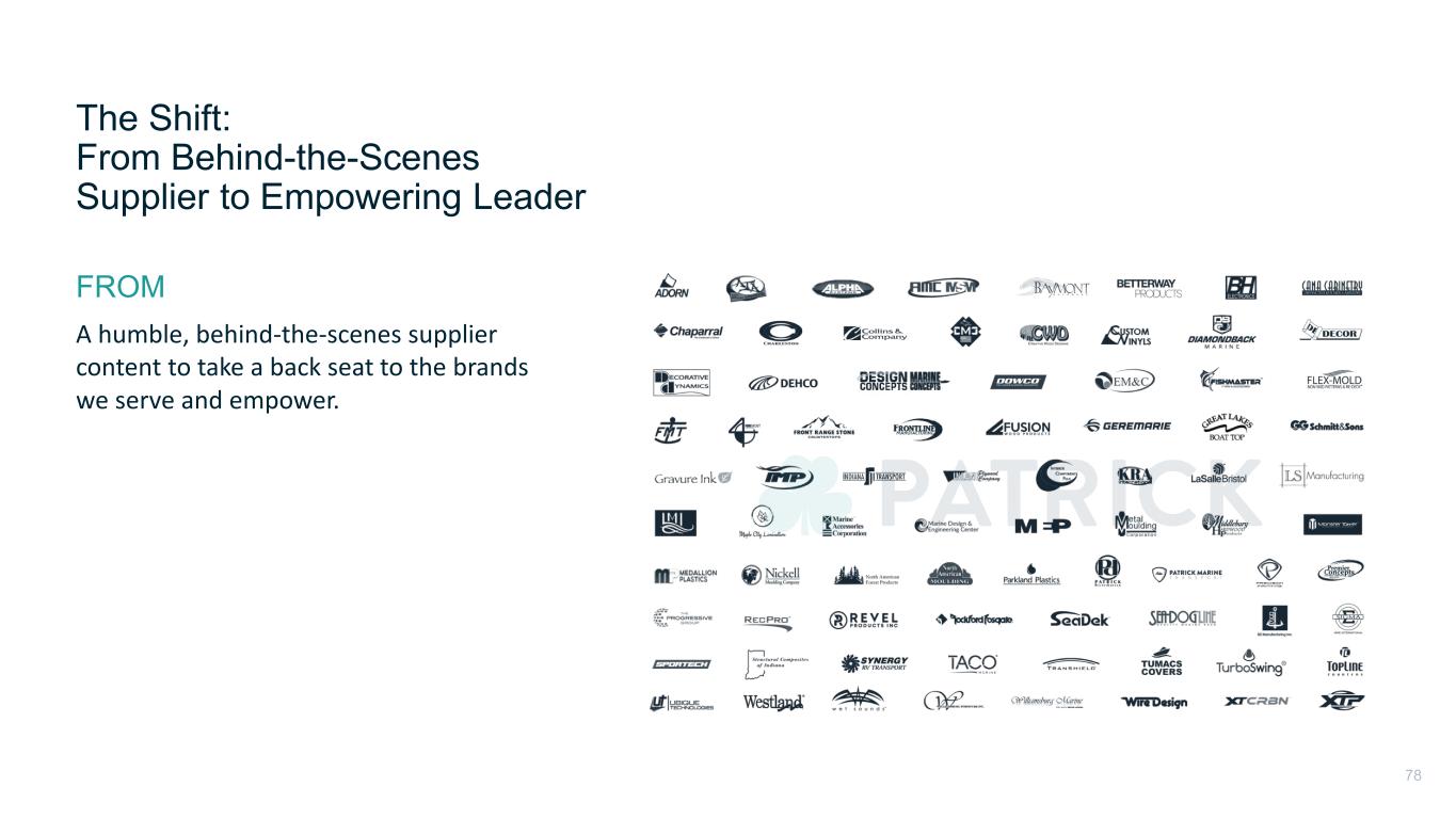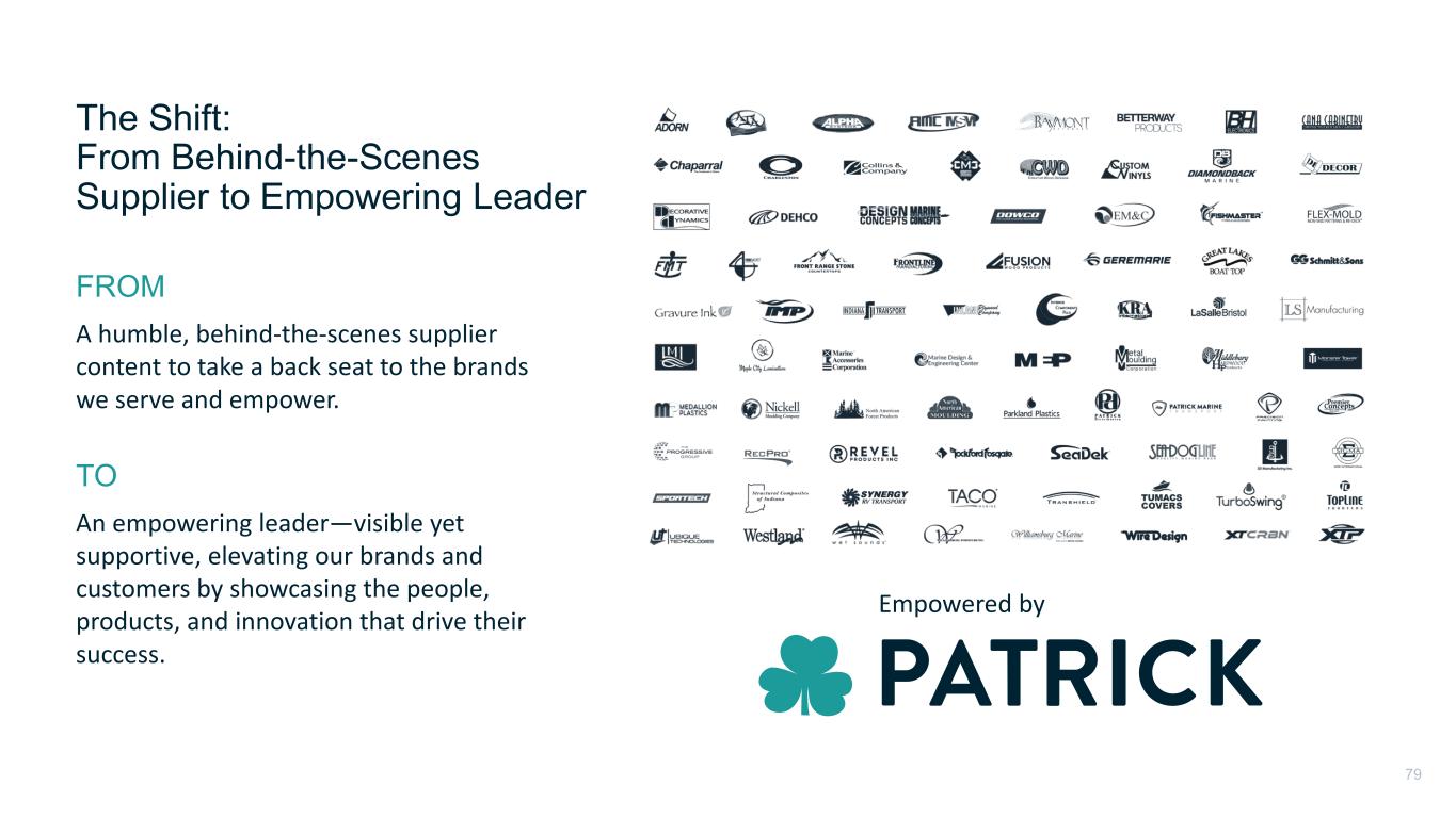 The Shift:​ From Behind-the-Scenes Supplier to Empowering Leader A humble, behind-the-scenes supplier content to take a back seat to the brands we serve and empower. ​ FROM Empowered by An empowering leader—visible yet supportive, elevating our brands and customers by showcasing the people, products, and innovation that drive their success. TO 79