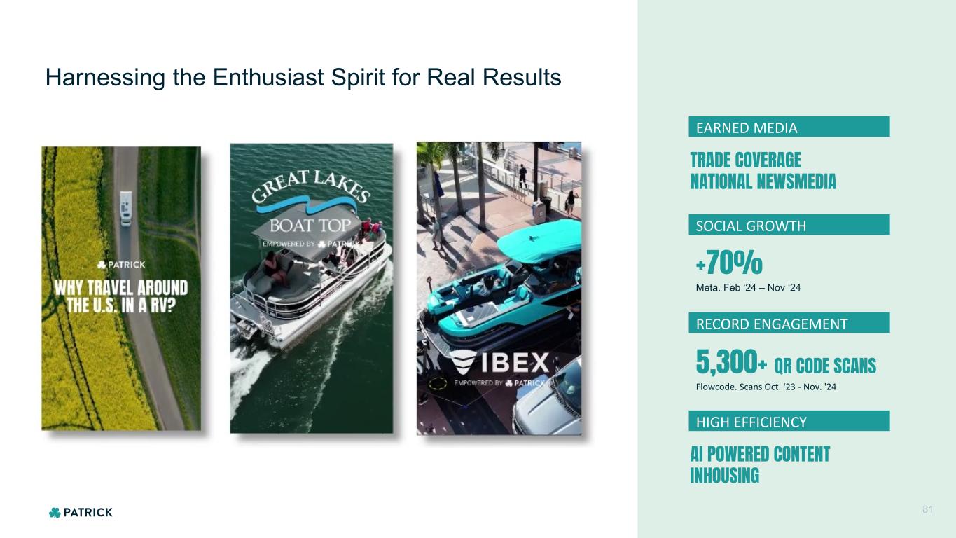 Harnessing the Enthusiast Spirit for Real Results EARNED MEDIA SOCIAL GROWTH RECORD ENGAGEMENT HIGH EFFICIENCY TRADE COVERAGE NATIONAL NEWSMEDIA +70% Meta. Feb ‘24 – Nov ‘24 5,300+ QR CODE SCANS Flowcode. Scans Oct. '23 - Nov. '24 AI POWERED CONTENT INHOUSING 81