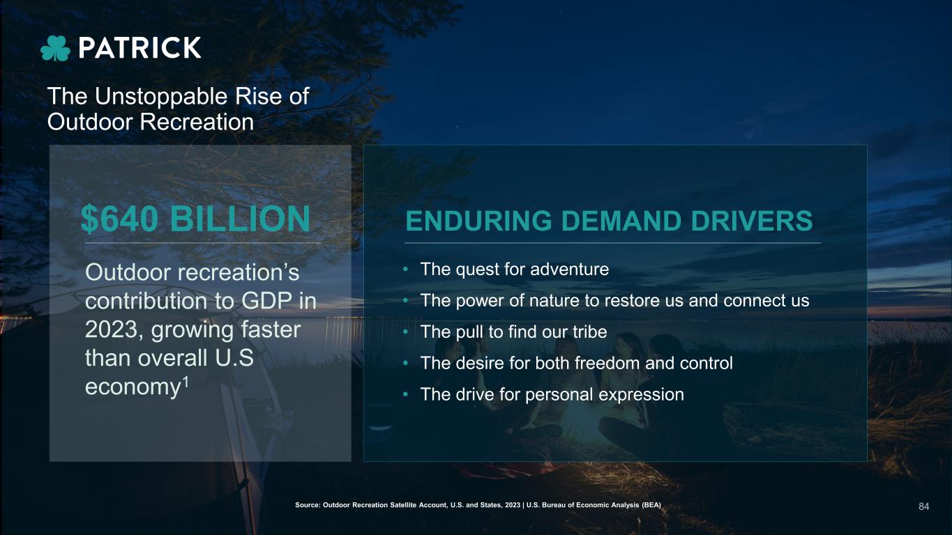 The Unstoppable Rise of Outdoor Recreation • The quest for adventure • The power of nature to restore us and connect us • The pull to find our tribe • The desire for both freedom and control • The drive for personal expression Outdoor recreation’s contribution to GDP in 2023, growing faster than overall U.S economy1 ENDURING DEMAND DRIVERS$640 BILLION 84Source: Outdoor Recreation Satellite Account, U.S. and States, 2023 | U.S. Bureau of Economic Analysis (BEA)