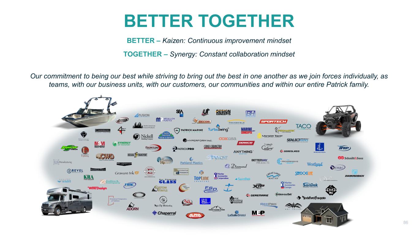 BETTER – Kaizen: Continuous improvement mindset TOGETHER – Synergy: Constant collaboration mindset Our commitment to being our best while striving to bring out the best in one another as we join forces individually, as teams, with our business units, with our customers, our communities and within our entire Patrick family. BETTER TOGETHER 86