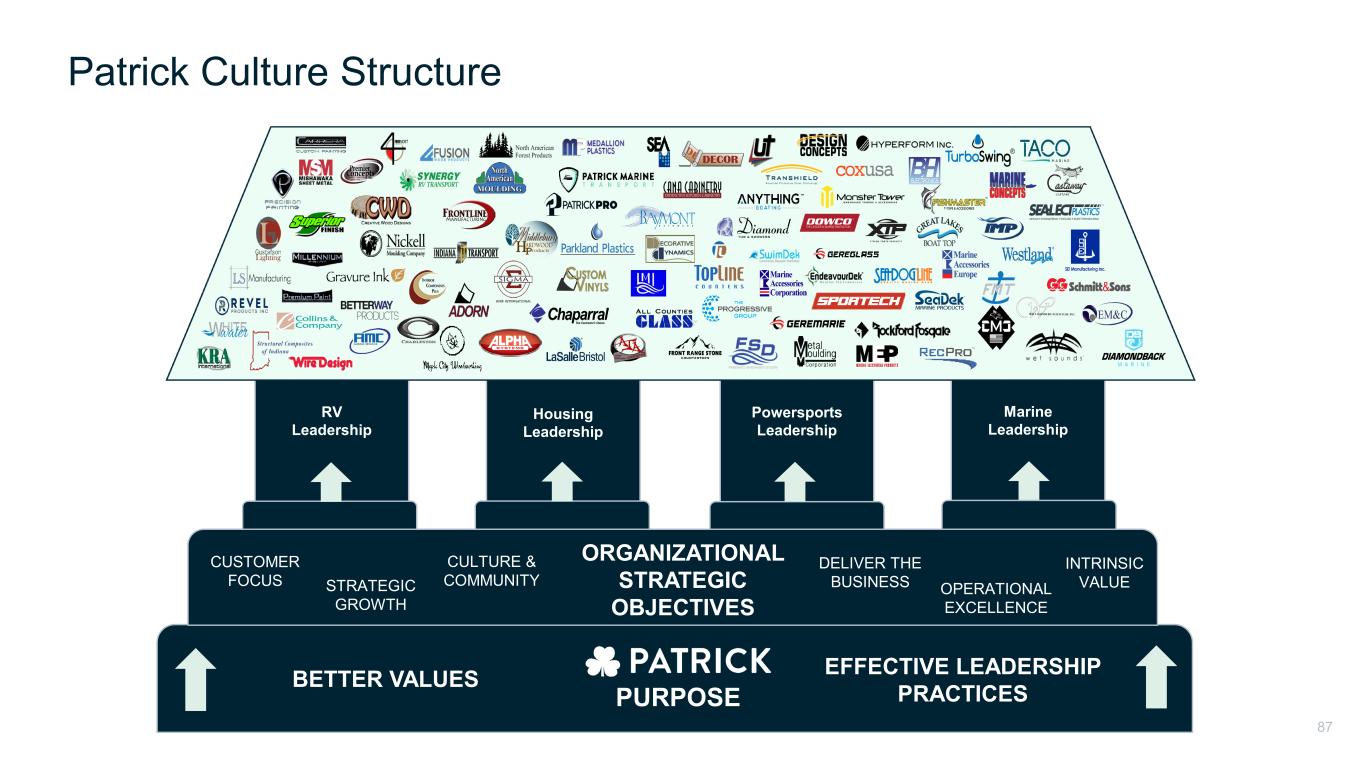 Marine Leadership Powersports Leadership Housing Leadership RV Leadership PURPOSE ORGANIZATIONAL STRATEGIC OBJECTIVES CUSTOMER FOCUS STRATEGIC GROWTH CULTURE & COMMUNITY DELIVER THE BUSINESS OPERATIONAL EXCELLENCE INTRINSIC VALUE BETTER VALUES EFFECTIVE LEADERSHIP PRACTICES Patrick Culture Structure 87