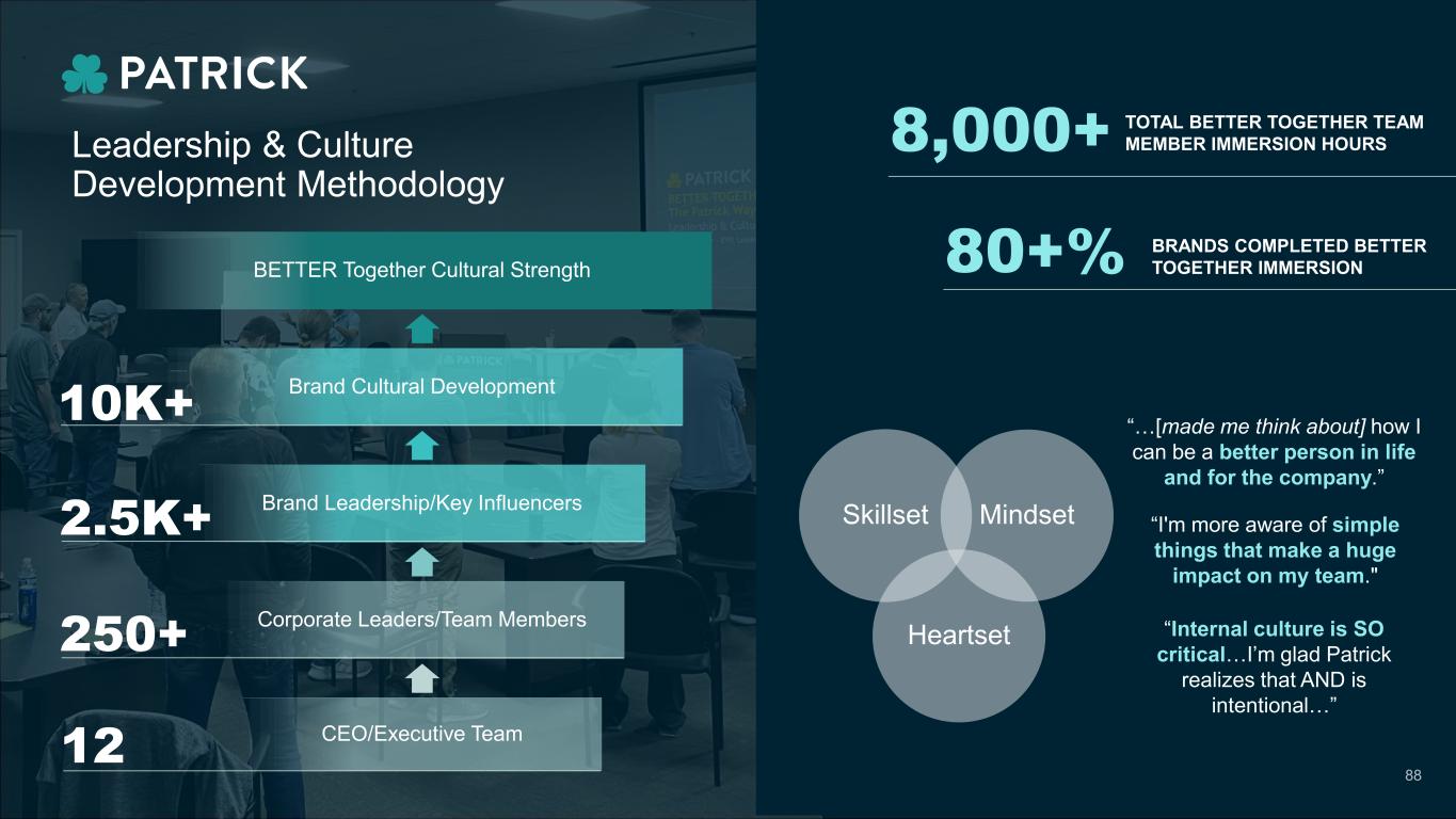 Leadership & Culture Development Methodology Skillset Heartset Mindset “…[made me think about] how I can be a better person in life and for the company.” “I'm more aware of simple things that make a huge impact on my team." “Internal culture is SO critical…I’m glad Patrick realizes that AND is intentional…” BETTER Together Cultural Strength Brand Cultural Development Brand Leadership/Key Influencers Corporate Leaders/Team Members CEO/Executive Team 2.5K+ 250+ 12 TOTAL BETTER TOGETHER TEAM MEMBER IMMERSION HOURS8,000+ BRANDS COMPLETED BETTER TOGETHER IMMERSION80+% 10K+ 88