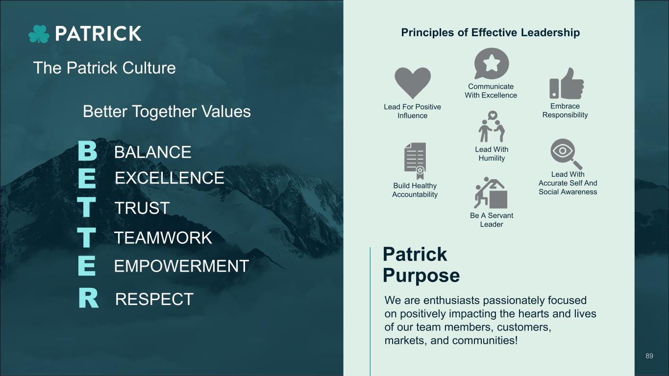The Patrick Culture Principles of Effective Leadership Better Together Values Patrick Purpose We are enthusiasts passionately focused on positively impacting the hearts and lives of our team members, customers, markets, and communities! Lead For Positive Influence Lead With Humility Embrace Responsibility Lead With Accurate Self And Social Awareness Communicate With Excellence Build Healthy Accountability Be A Servant Leader B E T T E R BALANCE EXCELLENCE TRUST TEAMWORK EMPOWERMENT RESPECT 89