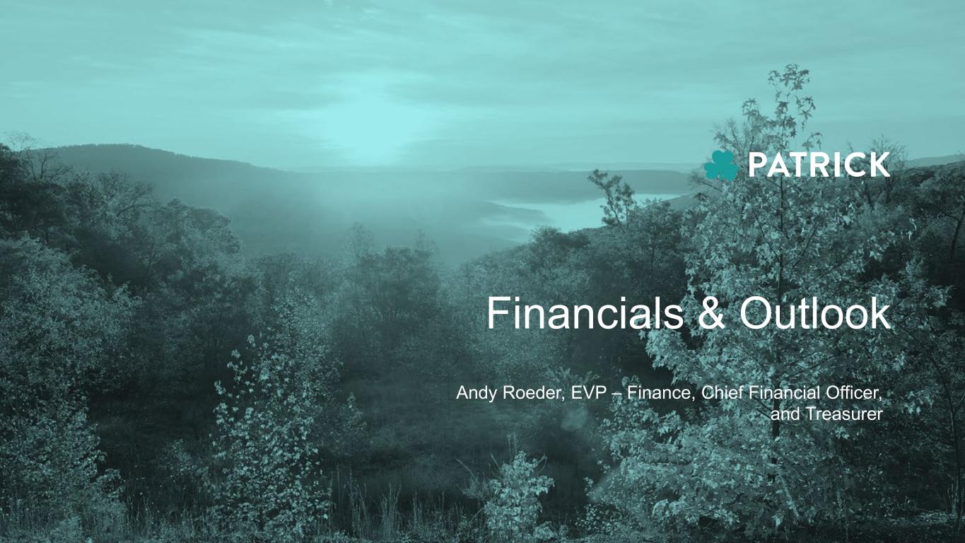 ALUMINUM SIDEWALLS PAINT 23 MARINE POWERSPORTS HOUSINGRV MARKETS LAMINATED PANELS CABINET DOORS FURNITURE FAUCETS & SINKS FLOORING ROOFING & TRUSSES COUNTERTOPS FIBERGLASS & COMPOSITES SOLAR & POWER SOLUTIONS DASH PANELS HOLDING TANKS PLASTICS & ADHESIVES Featured product categories are only a sampling of Patrick’s capabilities. A more complete listing can be found in our most recent 10-K. Established Supplier of Choice for RV OEMs