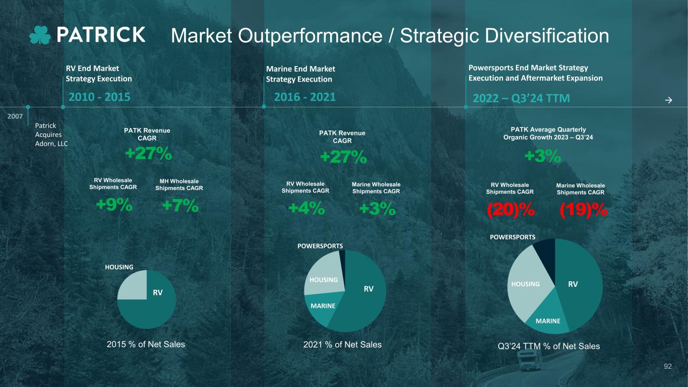 +27% PATK Revenue CAGR +27% PATK Revenue CAGR RVHOUSING MARINE 2015 % of Net Sales 2021 % of Net Sales Q3’24 TTM % of Net Sales POWERSPORTS RV HOUSING RV HOUSING MARINE POWERSPORTS +9% RV Wholesale Shipments CAGR +7% MH Wholesale Shipments CAGR +4% RV Wholesale Shipments CAGR +3% Marine Wholesale Shipments CAGR (20)% RV Wholesale Shipments CAGR Marine Wholesale Shipments CAGR Market Outperformance / Strategic Diversification (19)% PATK Average Quarterly Organic Growth 2023 – Q3’24 +3% 92  Patrick Acquires Adorn, LLC Powersports End Market Strategy Execution and Aftermarket Expansion RV End Market Strategy Execution Marine End Market Strategy Execution