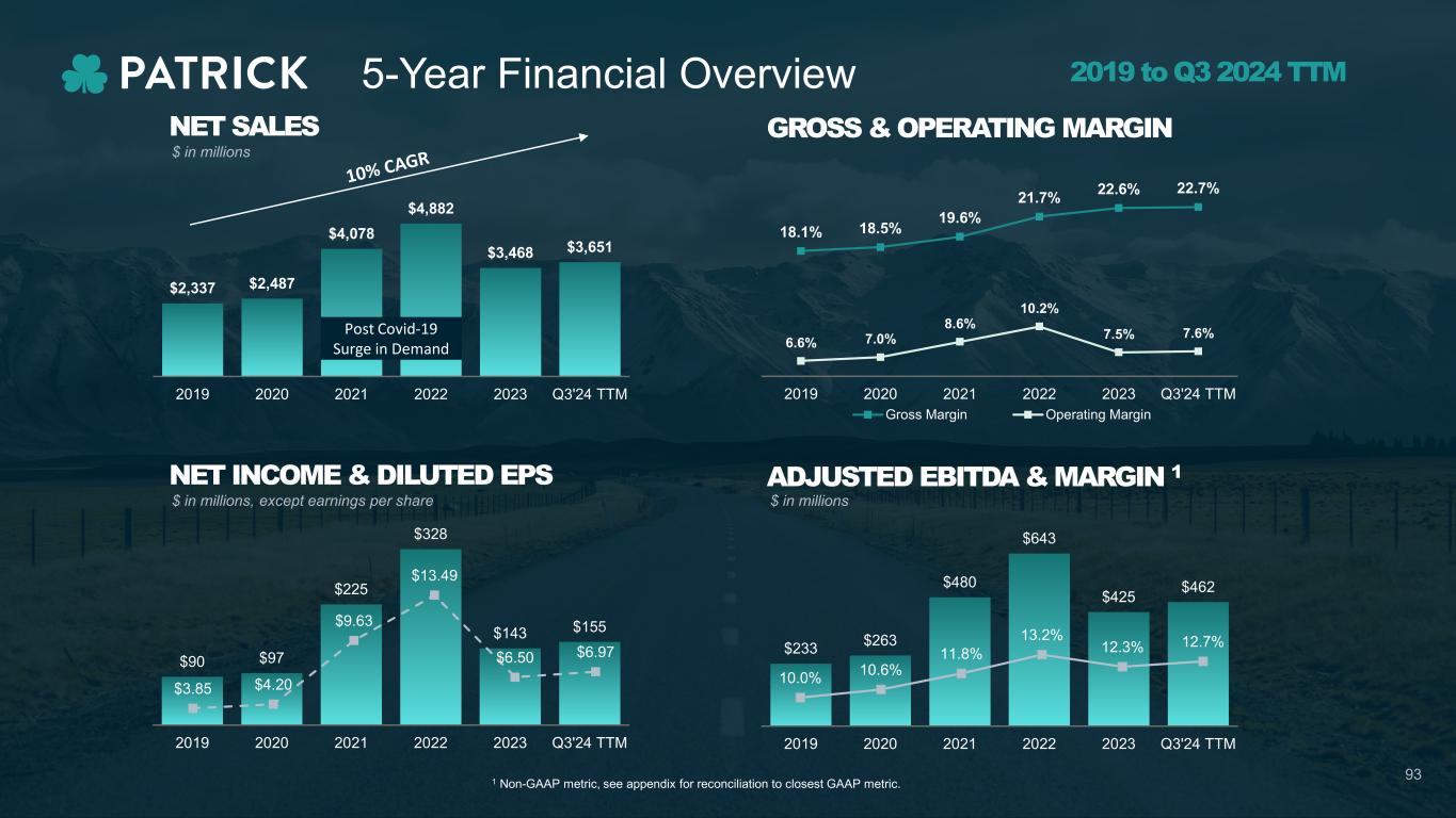 5-Year Financial Overview $2,337 $2,487 $4,078 $4,882 $3,468 $3,651 2019 2020 2021 2022 2023 Q3'24 TTM $ in millions 1 Non-GAAP metric, see appendix for reconciliation to closest GAAP metric. NET SALES Post Covid-19 Surge in Demand GROSS & OPERATING MARGIN $233 $263 $480 $643 $425 $462 2019 2020 2021 2022 2023 Q3'24 TTM $ in millions, except earnings per share NET INCOME & DILUTED EPS $ in millions ADJUSTED EBITDA & MARGIN 1 $90 $97 $225 $328 $143 $155 2019 2020 2021 2022 2023 Q3'24 TTM $3.85 $4.20 $9.63 $13.49 $6.50 $6.97 18.1% 18.5% 19.6% 21.7% 22.6% 22.7% 6.6% 7.0% 8.6% 10.2% 7.5% 7.6% 2019 2020 2021 2022 2023 Q3'24 TTM Gross Margin Operating Margin 10.0% 10.6% 11.8% 13.2% 12.3% 12.7% 2019 to Q3 2024 TTM 93