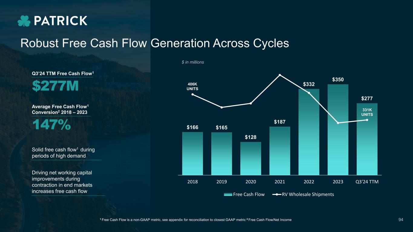 Solid free cash flow1 during periods of high demand Driving net working capital improvements during contraction in end markets increases free cash flow Q3’24 TTM Free Cash Flow1 $277M Average Free Cash Flow1 Conversion2 2018 – 2023 147% Aftermarket $166 $165 $128 $187 $332 $350 $277 0 100 200 300 400 500 600 700 $0 $50 $100 $150 $200 $250 $300 $350 $400 $450 2018 2019 2020 2021 2022 2023 Q3'24 TTM Free Cash Flow RV Wholesale Shipments 1 Free Cash Flow is a non-GAAP metric, see appendix for reconciliation to closest GAAP metric 2 Free Cash Flow/Net Income Robust Free Cash Flow Generation Across Cycles 94 $ in millions 406K UNITS 331K UNITS