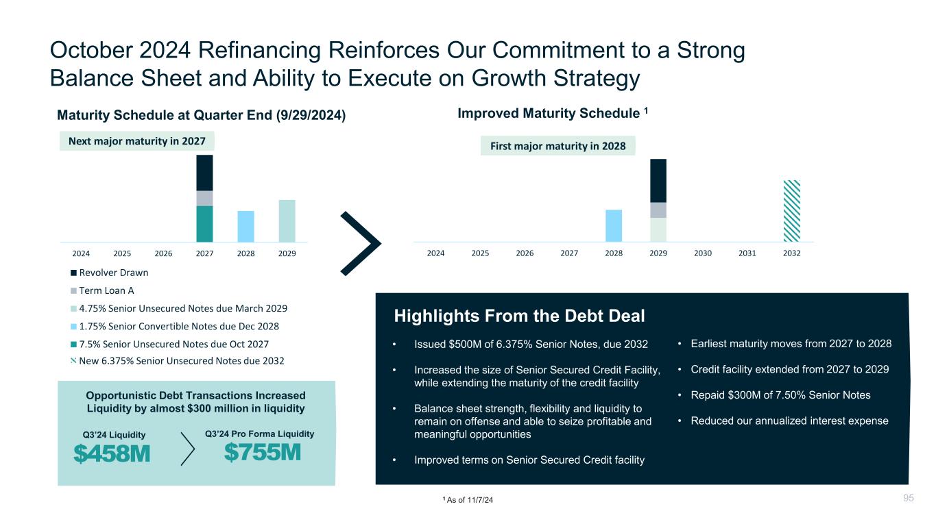 2024 2025 2026 2027 2028 2029 Revolver Drawn Term Loan A 4.75% Senior Unsecured Notes due March 2029 1.75% Senior Convertible Notes due Dec 2028 7.5% Senior Unsecured Notes due Oct 2027 October 2024 Refinancing Reinforces Our Commitment to a Strong Balance Sheet and Ability to Execute on Growth Strategy 2024 2025 2026 2027 2028 2029 2030 2031 2032 1 As of 11/7/24 • Issued $500M of 6.375% Senior Notes, due 2032 • Increased the size of Senior Secured Credit Facility, while extending the maturity of the credit facility • Balance sheet strength, flexibility and liquidity to remain on offense and able to seize profitable and meaningful opportunities • Improved terms on Senior Secured Credit facility Maturity Schedule at Quarter End (9/29/2024) • Earliest maturity moves from 2027 to 2028 • Credit facility extended from 2027 to 2029 • Repaid $300M of 7.50% Senior Notes • Reduced our annualized interest expense $458M Q3’24 Liquidity $755M Opportunistic Debt Transactions Increased Liquidity by almost $300 million in liquidity Highlights From the Debt Deal Improved Maturity Schedule 1 New 6.375% Senior Unsecured Notes due 2032 Q3’24 Pro Forma Liquidity Next major maturity in 2027 First major maturity in 2028 95