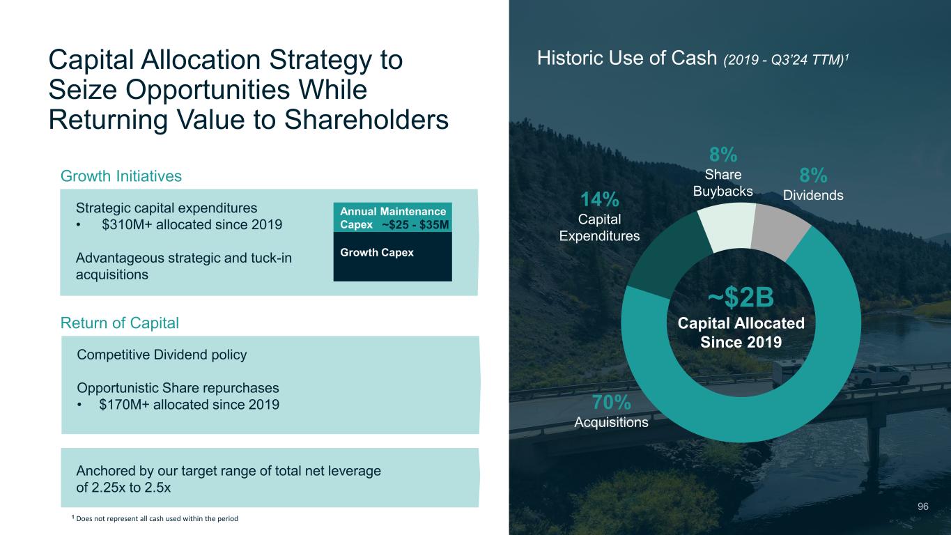 Capital Allocation Strategy to Seize Opportunities While Returning Value to Shareholders Historic Use of Cash (2019 - Q3’24 TTM)1 ~$2B Capital Allocated Since 2019 70% Acquisitions 8% Dividends 8% Share Buybacks14% Capital Expenditures Competitive Dividend policy Opportunistic Share repurchases • $170M+ allocated since 2019 Return of Capital Growth Initiatives Strategic capital expenditures • $310M+ allocated since 2019 Advantageous strategic and tuck-in acquisitions Anchored by our target range of total net leverage of 2.25x to 2.5x Growth Capex Annual Maintenance Capex 96 ~$25 - $35M 1 Does not represent all cash used within the period