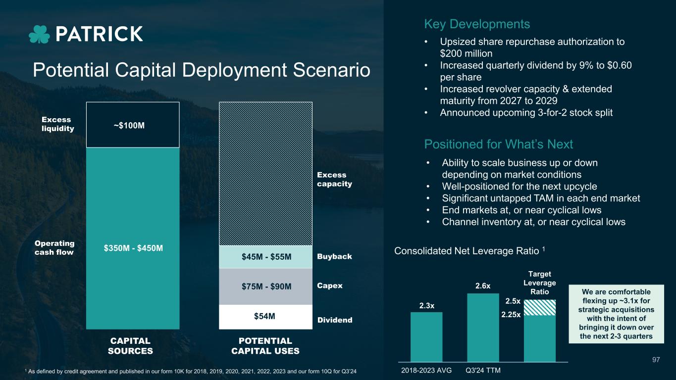 ~$100M Operating cash flow Capex Buyback Dividend CAPITAL SOURCES POTENTIAL CAPITAL USES Potential Capital Deployment Scenario • Upsized share repurchase authorization to $200 million • Increased quarterly dividend by 9% to $0.60 per share • Increased revolver capacity & extended maturity from 2027 to 2029 • Announced upcoming 3-for-2 stock split • Ability to scale business up or down depending on market conditions • Well-positioned for the next upcycle • Significant untapped TAM in each end market • End markets at, or near cyclical lows • Channel inventory at, or near cyclical lows Excess liquidity Excess capacity Key Developments Positioned for What’s Next 97 $350M - $450M $45M - $55M $75M - $90M $54M 2018-2023 AVG Q3'24 TTM Consolidated Net Leverage Ratio 1 Target Leverage Ratio 2.5x 2.25x We are comfortable flexing up ~3.1x for strategic acquisitions with the intent of bringing it down over the next 2-3 quarters 2.3x 2.6x 1 As defined by credit agreement and published in our form 10K for 2018, 2019, 2020, 2021, 2022, 2023 and our form 10Q for Q3’24​