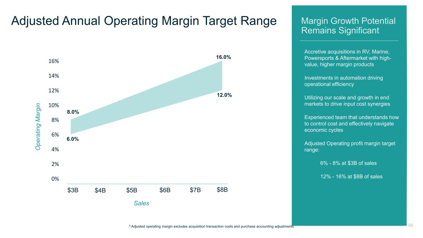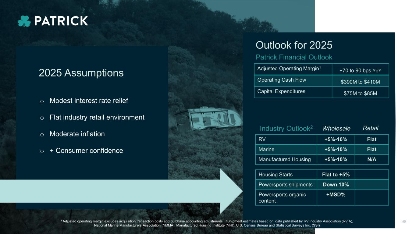 Outlook for 2025 o Modest interest rate relief o Flat industry retail environment o Moderate inflation o + Consumer confidence Patrick Financial Outlook Adjusted Operating Margin1 +70 to 90 bps YoY Operating Cash Flow $390M to $410M Capital Expenditures $75M to $85M Industry Outlook2 RV +5%-10% Flat Marine +5%-10% Flat Manufactured Housing +5%-10% N/A Wholesale Retail Housing Starts Flat to +5% Powersports shipments Down 10% Powersports organic content +MSD% 2025 Assumptions 1 Adjusted operating margin excludes acquisition transaction costs and purchase accounting adjustments | 2 Shipment estimates based on data published by RV Industry Association (RVIA), National Marine Manufacturers Association (NMMA), Manufactured Housing Institute (MHI), U.S. Census Bureau and Statistical Surveys Inc. (SSI) 98