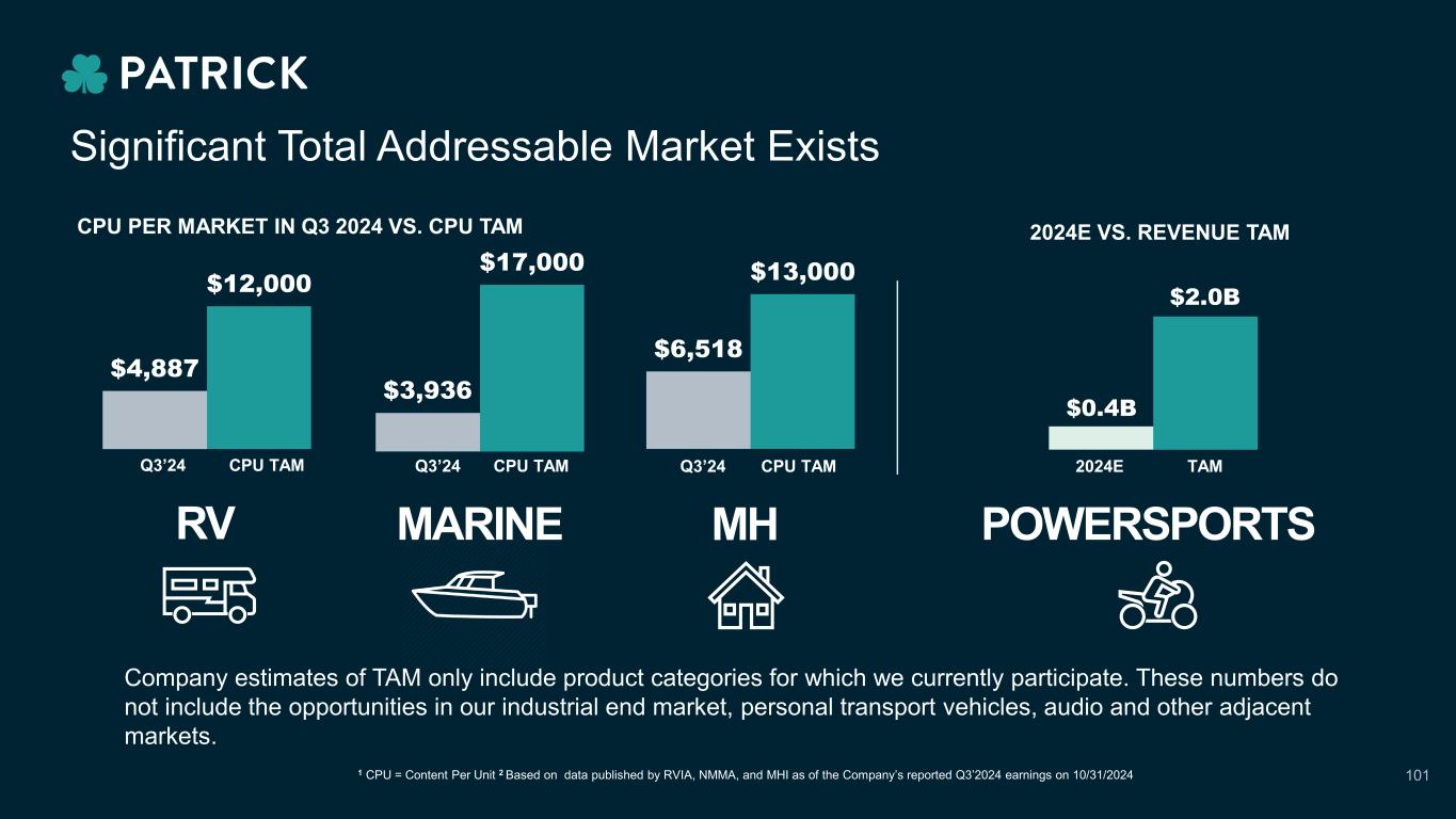 $6,518 $13,000 $4,887 $12,000 $3,936 $17,000 $0.4B $2.0B Significant Total Addressable Market Exists CPU PER MARKET IN Q3 2024 VS. CPU TAM RV Q3’24 CPU TAM MARINE Q3’24 CPU TAM MH Q3’24 CPU TAM 2024E VS. REVENUE TAM POWERSPORTS 2024E TAM Company estimates of TAM only include product categories for which we currently participate. These numbers do not include the opportunities in our industrial end market, personal transport vehicles, audio and other adjacent markets. 1 CPU = Content Per Unit 2 Based on data published by RVIA, NMMA, and MHI as of the Company’s reported Q3’2024 earnings on 10/31/2024 101