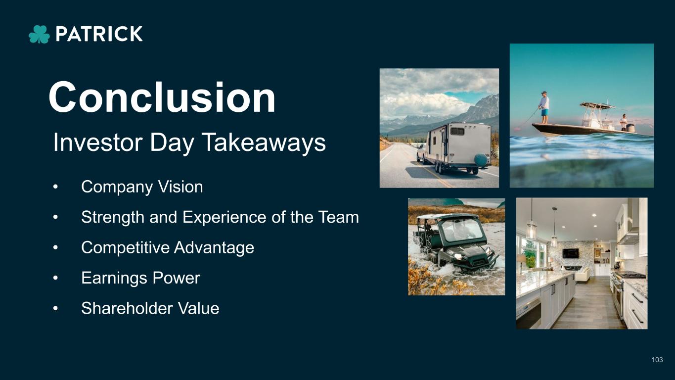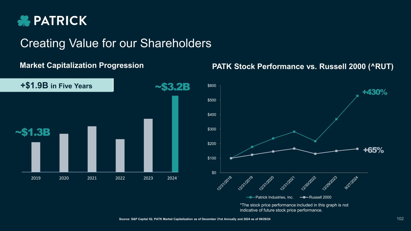 2019 2020 2021 2022 2023 2024 YTD ~$1.3B Aftermarket Creating Value for our Shareholders ~$3.2B+$1.9B in Five Years PATK Stock Performance vs. Russell 2000 (^RUT)Market Capitalization Progression Source: S&P Capital IQ; PATK Market Capitalization as of December 31st Annually and 2024 as of 09/29/24 102 +430% +65% *The stock price performance included in this graph is not indicative of future stock price performance. $0 $100 $200 $300 $400 $500 $600 Patrick Industries, Inc. Russell 2000