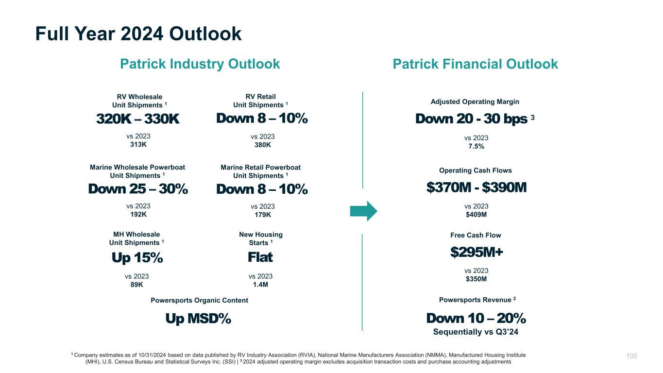 Down 8 – 10% Marine Retail Powerboat Unit Shipments 1 320K – 330K RV Wholesale Unit Shipments 1 Down 25 – 30% Marine Wholesale Powerboat Unit Shipments 1 Down 8 – 10% RV Retail Unit Shipments 1 Up 15% MH Wholesale Unit Shipments 1 Flat New Housing Starts 1 Full Year 2024 Outlook 105 Patrick Industry Outlook Patrick Financial Outlook Down 20 - 30 bps 3 Adjusted Operating Margin $370M - $390M Operating Cash Flows $295M+ Free Cash Flow vs 2023 313K vs 2023 380K vs 2023 192K vs 2023 179K vs 2023 89K vs 2023 1.4M 1 Company estimates as of 10/31/2024 based on data published by RV Industry Association (RVIA), National Marine Manufacturers Association (NMMA), Manufactured Housing Institute (MHI), U.S. Census Bureau and Statistical Surveys Inc. (SSI) | 3 2024 adjusted operating margin excludes acquisition transaction costs and purchase accounting adjustments vs 2023 7.5% vs 2023 $409M vs 2023 $350M Down 10 – 20% Sequentially vs Q3’24 Powersports Revenue 2 Up MSD% Powersports Organic Content