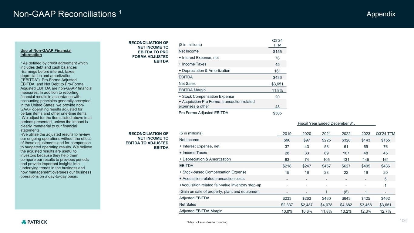 Non-GAAP Reconciliations 1 Appendix RECONCILIATION OF NET INCOME TO EBITDA TO PRO FORMA ADJUSTED EBITDA ($ in millions) Q3’24 TTM Net Income $155 + Interest Expense, net 76 + Income Taxes 45 + Depreciation & Amortization 161 EBITDA $436 Net Sales $3,651 EBITDA Margin 11.9% + Stock Compensation Expense 20 + Acquisition Pro Forma, transaction-related expenses & other 48 Pro Forma Adjusted EBITDA $505 1 May not sum due to rounding 106 Use of Non-GAAP Financial Information * As defined by credit agreement which includes debt and cash balances -Earnings before interest, taxes, depreciation and amortization (“EBITDA”), Pro-Forma Adjusted EBITDA, and Net Debt to Pro-Forma Adjusted EBITDA are non-GAAP financial measures. In addition to reporting financial results in accordance with accounting principles generally accepted in the United States, we provide non- GAAP operating results adjusted for certain items and other one-time items. -We adjust for the items listed above in all periods presented, unless the impact is clearly immaterial to our financial statements. -We utilize the adjusted results to review our ongoing operations without the effect of these adjustments and for comparison to budgeted operating results. We believe the adjusted results are useful to investors because they help them compare our results to previous periods and provide important insights into underlying trends in the business and how management oversees our business operations on a day-to-day basis. RECONCILIATION OF NET INCOME TO EBITDA TO ADJUSTED EBITDA Fiscal Year Ended December 31, ($ in millions) 2019 2020 2021 2022 2023 Q3’24 TTM Net Income $90 $97 $225 $328 $143 $155 + Interest Expense, net 37 43 58 61 69 76 + Income Taxes 28 33 69 107 48 45 + Depreciation & Amortization 63 74 105 131 145 161 EBITDA $218 $247 $457 $627 $405 $436 + Stock-based Compensation Expense 15 16 23 22 19 20 + Acquisition related transaction costs - - - - - 5 +Acquisition related fair-value inventory step-up - - - - - 1 -Gain on sale of property, plant and equipment - - 1 (6) 1 - Adjusted EBITDA $233 $263 $480 $643 $425 $462 Net Sales $2,337 $2,487 $4,078 $4,882 $3,468 $3,651 Adjusted EBITDA Margin 10.0% 10.6% 11.8% 13.2% 12.3% 12.7%