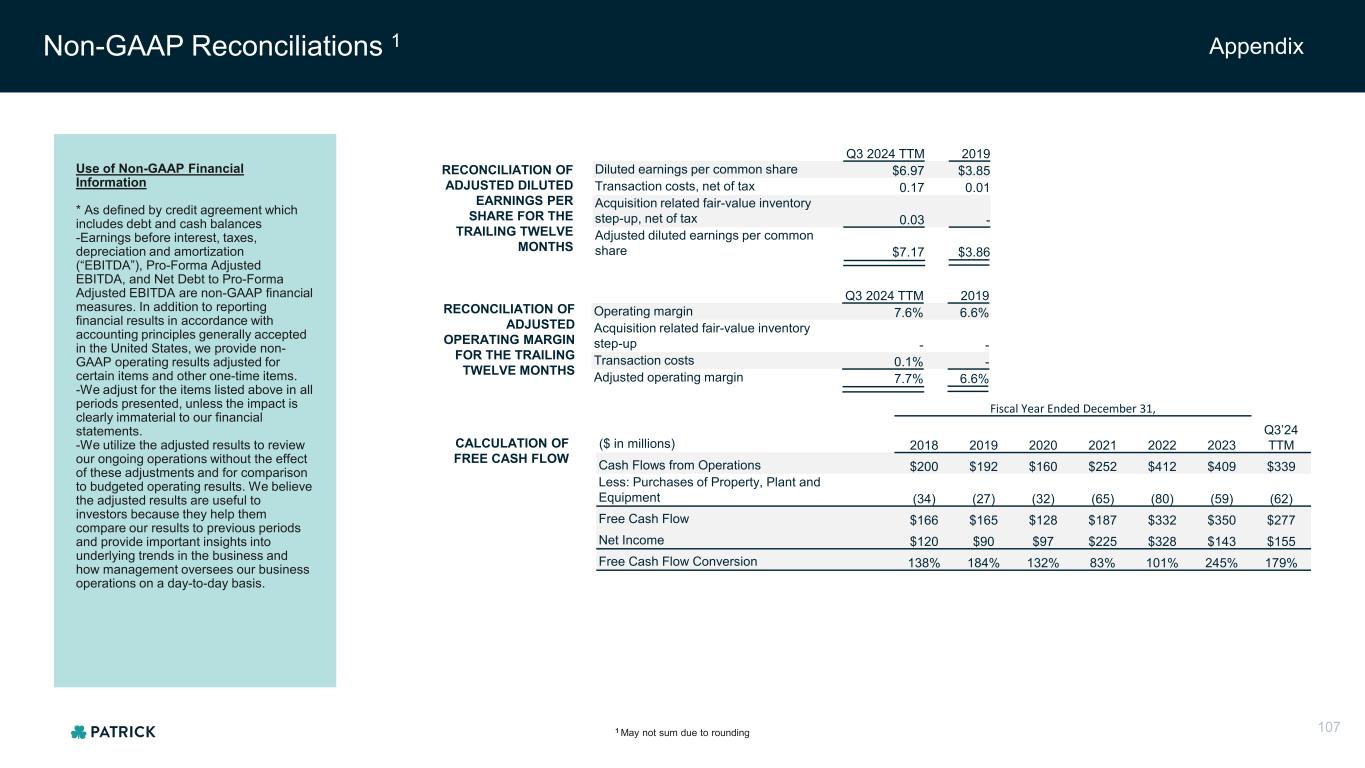 Non-GAAP Reconciliations 1 Appendix Use of Non-GAAP Financial Information * As defined by credit agreement which includes debt and cash balances -Earnings before interest, taxes, depreciation and amortization (“EBITDA”), Pro-Forma Adjusted EBITDA, and Net Debt to Pro-Forma Adjusted EBITDA are non-GAAP financial measures. In addition to reporting financial results in accordance with accounting principles generally accepted in the United States, we provide non- GAAP operating results adjusted for certain items and other one-time items. -We adjust for the items listed above in all periods presented, unless the impact is clearly immaterial to our financial statements. -We utilize the adjusted results to review our ongoing operations without the effect of these adjustments and for comparison to budgeted operating results. We believe the adjusted results are useful to investors because they help them compare our results to previous periods and provide important insights into underlying trends in the business and how management oversees our business operations on a day-to-day basis. RECONCILIATION OF ADJUSTED DILUTED EARNINGS PER SHARE FOR THE TRAILING TWELVE MONTHS Q3 2024 TTM 2019 Diluted earnings per common share $6.97 $3.85 Transaction costs, net of tax 0.17 0.01 Acquisition related fair-value inventory step-up, net of tax 0.03 - Adjusted diluted earnings per common share $7.17 $3.86 Q3 2024 TTM 2019 Operating margin 7.6% 6.6% Acquisition related fair-value inventory step-up - - Transaction costs 0.1% - Adjusted operating margin 7.7% 6.6% RECONCILIATION OF ADJUSTED OPERATING MARGIN FOR THE TRAILING TWELVE MONTHS 1 May not sum due to rounding 107 Fiscal Year Ended December 31, ($ in millions) 2018 2019 2020 2021 2022 2023 Q3’24 TTM Cash Flows from Operations $200 $192 $160 $252 $412 $409 $339 Less: Purchases of Property, Plant and Equipment (34) (27) (32) (65) (80) (59) (62) Free Cash Flow $166 $165 $128 $187 $332 $350 $277 Net Income $120 $90 $97 $225 $328 $143 $155 Free Cash Flow Conversion 138% 184% 132% 83% 101% 245% 179% CALCULATION OF FREE CASH FLOW