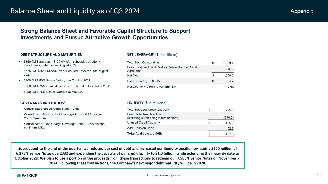 Balance Sheet and Liquidity as of Q3 2024 Appendix 1 As defined by credit agreement COVENANTS AND RATIOS1 DEBT STRUCTURE AND MATURITIES NET LEVERAGE1 ($ in millions) LIQUIDITY ($ in millions) • $150.0M Term Loan ($125.6M o/s), scheduled quarterly installments; balance due August 2027 • $775.0M ($365.0M o/s) Senior Secured Revolver, due August 2027 • $300.0M 7.50% Senior Notes, due October 2027 • $258.8M 1.75% Convertible Senior Notes, due December 2028 • $350.0M 4.75% Senior Notes, due May 2029 Total Debt Outstanding $ 1,399.4 Less: Cash and Debt Paid as Defined by the Credit Agreement (63.2) Net Debt $ 1,336.2 Pro Forma Adj. EBITDA $ 504.7 Net Debt to Pro Forma Adj. EBITDA 2.6x Total Revolver Credit Capacity $ 775.0 Less: Total Revolver Used (including outstanding letters of credit) (370.0) Unused Credit Capacity $ 405.0 Add: Cash on Hand 52.6 Total Available Liquidity $ 457.6 • Consolidated Net Leverage Ratio – 2.6x • Consolidated Secured Net Leverage Ratio – 0.85x versus 2.75x maximum • Consolidated Fixed Charge Coverage Ratio – 3.55x versus minimum 1.50x Strong Balance Sheet and Favorable Capital Structure to Support Investments and Pursue Attractive Growth Opportunities Subsequent to the end of the quarter, we reduced our cost of debt and increased our liquidity position by issuing $500 million of 6.375% Senior Notes due 2032 and expanding the capacity of our credit facility to $1.0 billion, while extending the maturity date to October 2029. We plan to use a portion of the proceeds from these transactions to redeem our 7.500% Senior Notes on November 7, 2024. Following these transactions, the Company’s next major debt maturity will be in 2028. 108