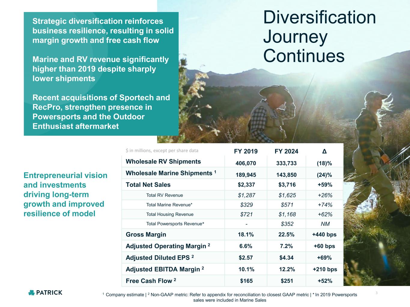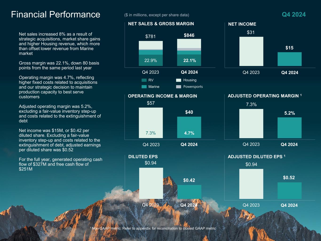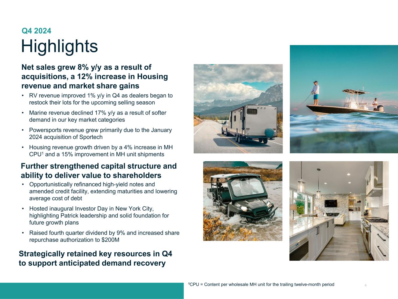 3 $ in millions, except per share data FY 2019 FY 2024 Δ Wholesale RV Shipments 406,070 333,733 (18)% Wholesale Marine Shipments 1 189,945 143,850 (24)% Total Net Sales $2,337 $3,716 +59% Total RV Revenue $1,287 $1,625 +26% Total Marine Revenue* $329 $571 +74% Total Housing Revenue $721 $1,168 +62% Total Powersports Revenue* - $352 NM Gross Margin 18.1% 22.5% +440 bps Adjusted Operating Margin 2 6.6% 7.2% +60 bps Adjusted Diluted EPS 2 $2.57 $4.34 +69% Adjusted EBITDA Margin 2 10.1% 12.2% +210 bps Free Cash Flow 2 $165 $251 +52% Diversification Journey Continues Entrepreneurial vision and investments driving long-term growth and improved resilience of model Strategic diversification reinforces business resilience, resulting in solid margin growth and free cash flow Marine and RV revenue significantly higher than 2019 despite sharply lower shipments Recent acquisitions of Sportech and RecPro, strengthen presence in Powersports and the Outdoor Enthusiast aftermarket 1 Company estimate | 2 Non-GAAP metric: Refer to appendix for reconciliation to closest GAAP metric | * In 2019 Powersports sales were included in Marine Sales