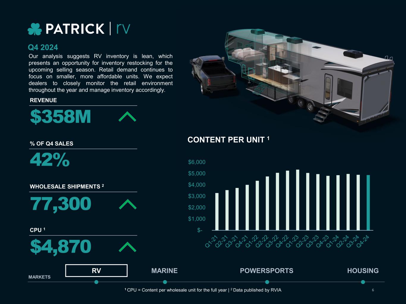 4 Highlights Q4 2024 Net sales grew 8% y/y as a result of acquisitions, a 12% increase in Housing revenue and market share gains • RV revenue improved 1% y/y in Q4 as dealers began to restock their lots for the upcoming selling season • Marine revenue declined 17% y/y as a result of softer demand in our key market categories • Powersports revenue grew primarily due to the January 2024 acquisition of Sportech • Housing revenue growth driven by a 4% increase in MH CPU1 and a 15% improvement in MH unit shipments Further strengthened capital structure and ability to deliver value to shareholders • Opportunistically refinanced high-yield notes and amended credit facility, extending maturities and lowering average cost of debt • Hosted inaugural Investor Day in New York City, highlighting Patrick leadership and solid foundation for future growth plans • Raised fourth quarter dividend by 9% and increased share repurchase authorization to $200M Strategically retained key resources in Q4 to support anticipated demand recovery 1CPU = Content per wholesale MH unit for the trailing twelve-month period