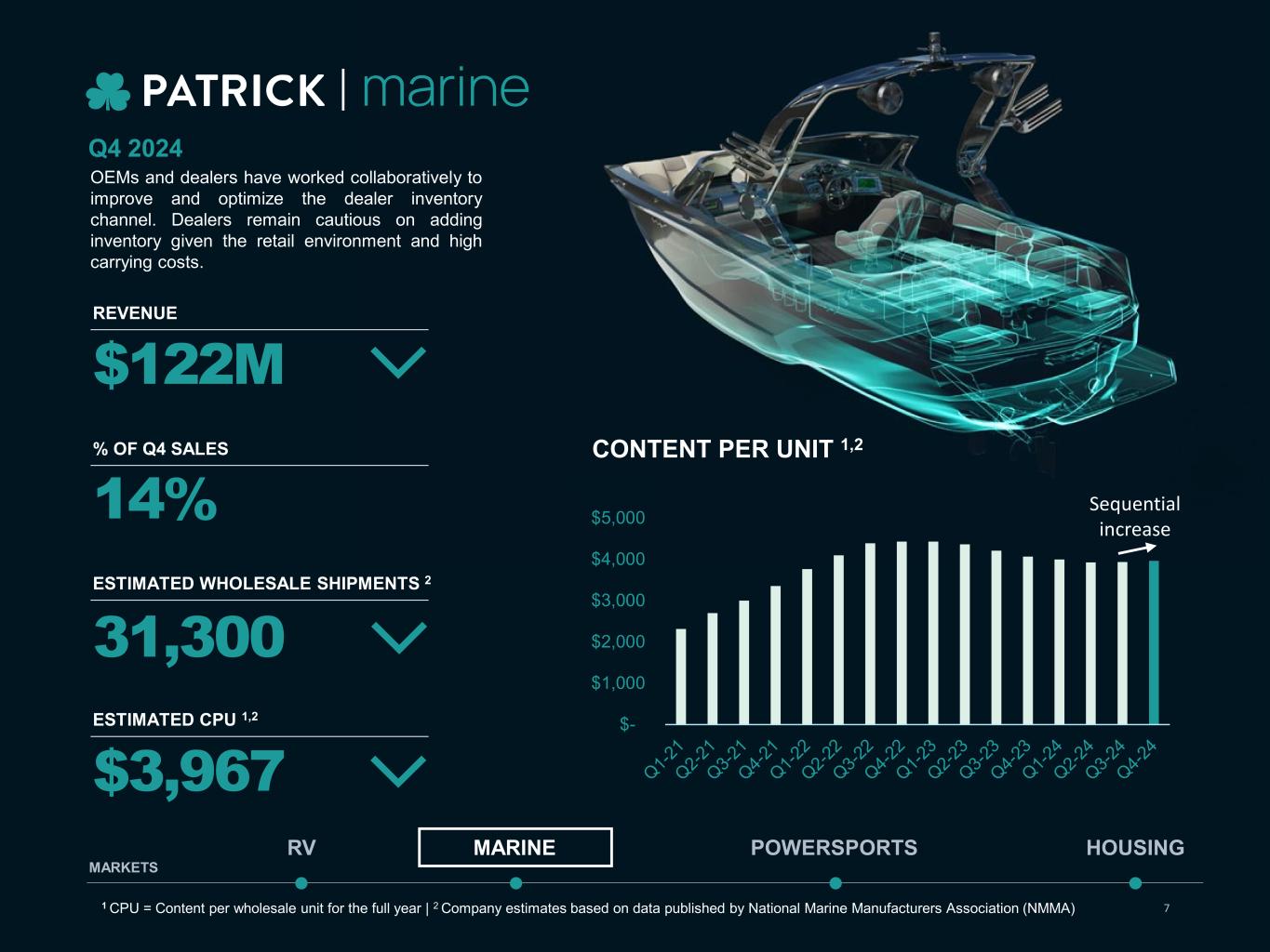 Our analysis suggests RV inventory is lean, which presents an opportunity for inventory restocking for the upcoming selling season. Retail demand continues to focus on smaller, more affordable units. We expect dealers to closely monitor the retail environment throughout the year and manage inventory accordingly. 6 $358M REVENUE % OF Q4 SALES 42% WHOLESALE SHIPMENTS 2 CPU 1 $4,870 77,300 $- $1,000 $2,000 $3,000 $4,000 $5,000 $6,000 $7,000 CONTENT PER UNIT 1 1 CPU = Content per wholesale unit for the full year | 2 Data published by RVIA Q4 2024 MARINE POWERSPORTS HOUSINGRV MARKETS
