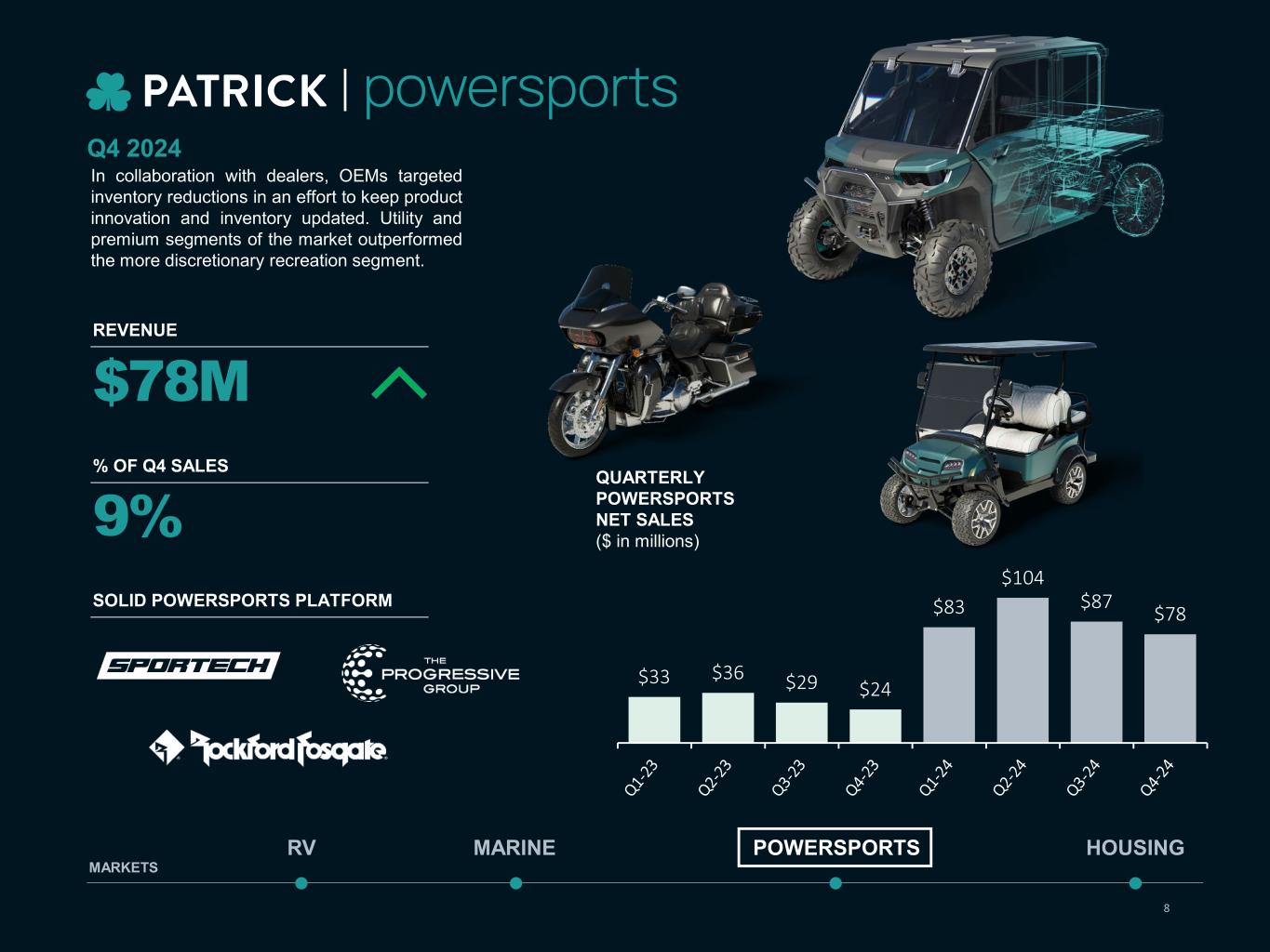$- $1,000 $2,000 $3,000 $4,000 $5,000 $6,000 CONTENT PER UNIT 1,2 7 $122M REVENUE % OF Q4 SALES 14% ESTIMATED WHOLESALE SHIPMENTS 2 ESTIMATED CPU 1,2 $3,967 31,300 1 CPU = Content per wholesale unit for the full year | 2 Company estimates based on data published by National Marine Manufacturers Association (NMMA) MARINE POWERSPORTS HOUSINGRV MARKETS Q4 2024 OEMs and dealers have worked collaboratively to improve and optimize the dealer inventory channel. Dealers remain cautious on adding inventory given the retail environment and high carrying costs. Sequential increase