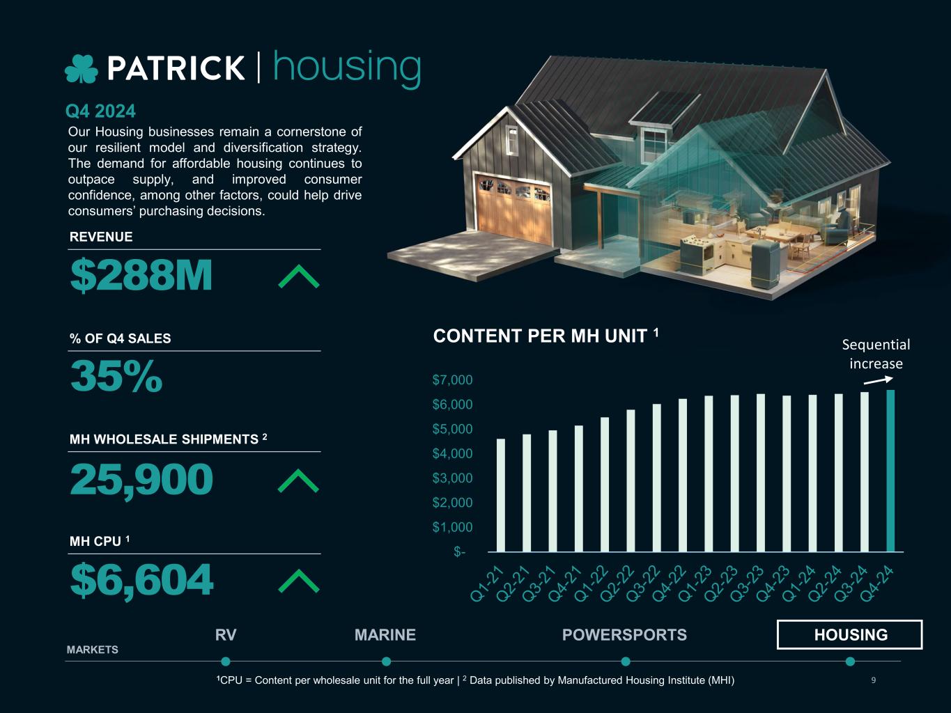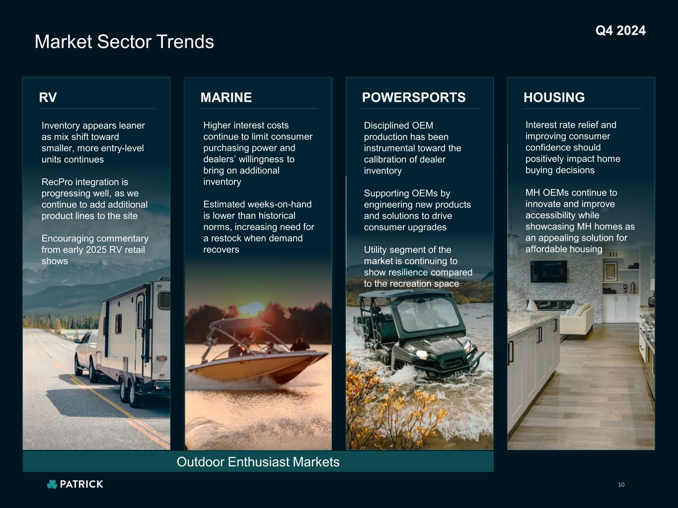 $- $1,000 $2,000 $3,000 $4,000 $5,000 $6,000 $7,000 $8,000 CONTENT PER MH UNIT 1 Our Housing businesses remain a cornerstone of our resilient model and diversification strategy. The demand for affordable housing continues to outpace supply, and improved consumer confidence, among other factors, could help drive consumers’ purchasing decisions. 9 $288M REVENUE % OF Q4 SALES 35% MH WHOLESALE SHIPMENTS 2 MH CPU 1 $6,604 25,900 1CPU = Content per wholesale unit for the full year | 2 Data published by Manufactured Housing Institute (MHI) MARINE POWERSPORTS HOUSINGRV MARKETS Q4 2024 Sequential increase