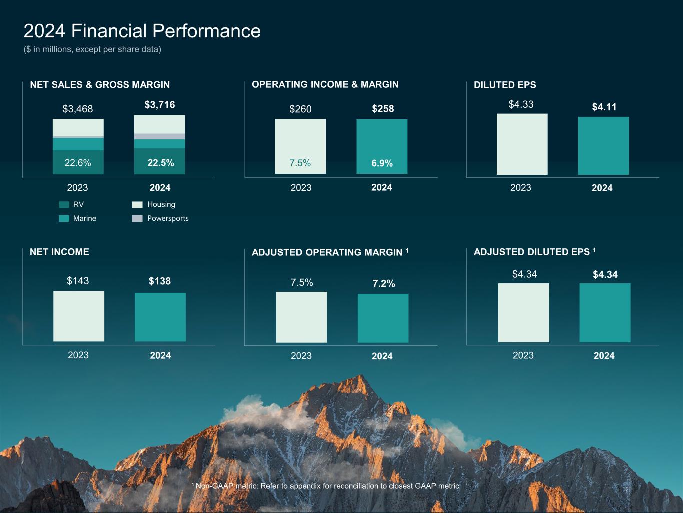 2024 Financial Performance 12 NET SALES & GROSS MARGIN $3,716$3,468 2023 2024 22.5%22.6% Powersports Housing Marine RV OPERATING INCOME & MARGIN 6.9%7.5% 2023 2024 DILUTED EPS 2023 2024 ADJUSTED DILUTED EPS 1 2023 2024 ($ in millions, except per share data) $4.34$4.34 ADJUSTED OPERATING MARGIN 1 2023 2024 7.2%7.5% NET INCOME 2023 2024 $138$143 1 Non-GAAP metric: Refer to appendix for reconciliation to closest GAAP metric $258$260 $4.11$4.33