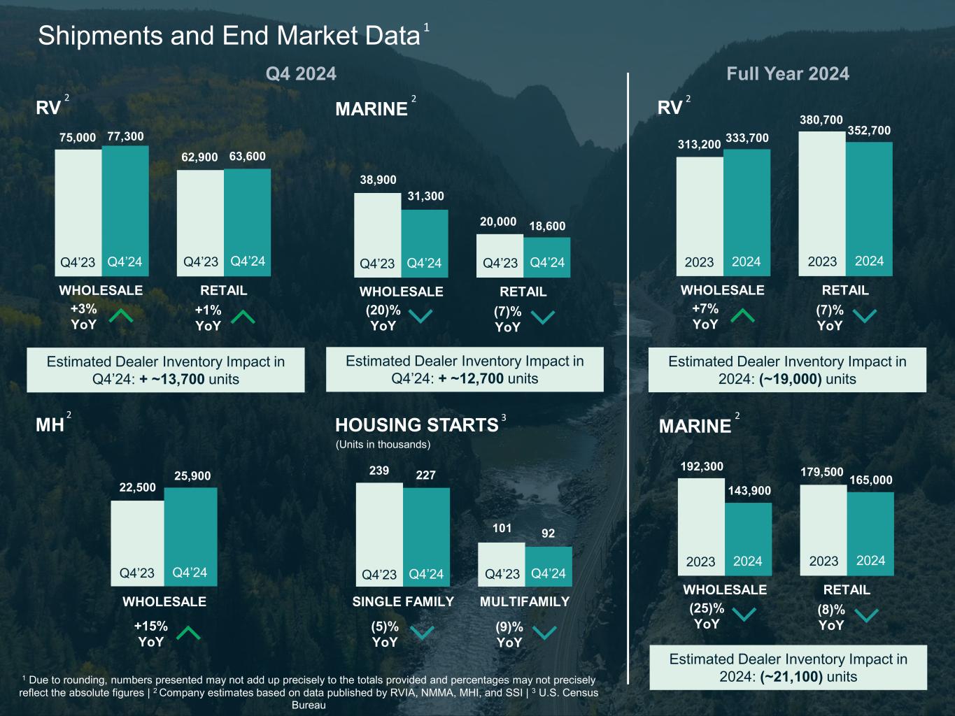 Shipments and End Market Data RETAILWHOLESALE 63,600 77,300 +1% YoY +3% YoY RV RETAILWHOLESALE 18,600 31,300 (7)% YoY (20)% YoY MARINE WHOLESALE 25,900 +15% YoY MH MULTIFAMILYSINGLE FAMILY 101 239 (9)% YoY (5)% YoY HOUSING STARTS 75,000 62,900 38,900 20,000 22,500 227 Q4’23 Q4’24 Q4’23 Q4’24 Q4’23 Q4’24 Q4’23 Q4’24 Q4’23 Q4’24 Q4’23 Q4’24Q4’23 Q4’24 1 Due to rounding, numbers presented may not add up precisely to the totals provided and percentages may not precisely reflect the absolute figures | 2 Company estimates based on data published by RVIA, NMMA, MHI, and SSI | 3 U.S. Census Bureau Estimated Dealer Inventory Impact in Q4’24: + ~13,700 units Estimated Dealer Inventory Impact in Q4’24: + ~12,700 units (Units in thousands) 92 RETAILWHOLESALE 352,700333,700 (7)% YoY +7% YoY RV 313,200 380,700 2023 2024 2023 2024 Estimated Dealer Inventory Impact in 2024: (~19,000) units RETAILWHOLESALE 165,000 143,900 (8)% YoY (25)% YoY MARINE 192,300 179,500 2023 2024 2023 2024 Estimated Dealer Inventory Impact in 2024: (~21,100) units Full Year 2024Q4 2024 2 2 2 3 2 2 1