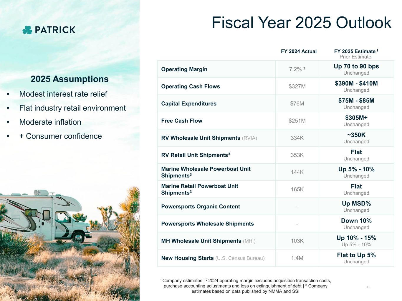Operating Margin 7.2% 2 Up 70 to 90 bps Unchanged Operating Cash Flows $327M $390M - $410M Unchanged Capital Expenditures $76M $75M - $85M Unchanged Free Cash Flow $251M $305M+ Unchanged RV Wholesale Unit Shipments (RVIA) 334K ~350K Unchanged RV Retail Unit Shipments3 353K Flat Unchanged Marine Wholesale Powerboat Unit Shipments3 144K Up 5% - 10% Unchanged Marine Retail Powerboat Unit Shipments3 165K Flat Unchanged Powersports Organic Content - Up MSD% Unchanged Powersports Wholesale Shipments - Down 10% Unchanged MH Wholesale Unit Shipments (MHI) 103K Up 10% - 15% Up 5% - 10% New Housing Starts (U.S. Census Bureau) 1.4M Flat to Up 5% Unchanged FY 2024 Actual FY 2025 Estimate 1 Fiscal Year 2025 Outlook 15 1 Company estimates | 2 2024 operating margin excludes acquisition transaction costs, purchase accounting adjustments and loss on extinguishment of debt | 3 Company estimates based on data published by NMMA and SSI Prior Estimate 2025 Assumptions • Modest interest rate relief • Flat industry retail environment • Moderate inflation • + Consumer confidence