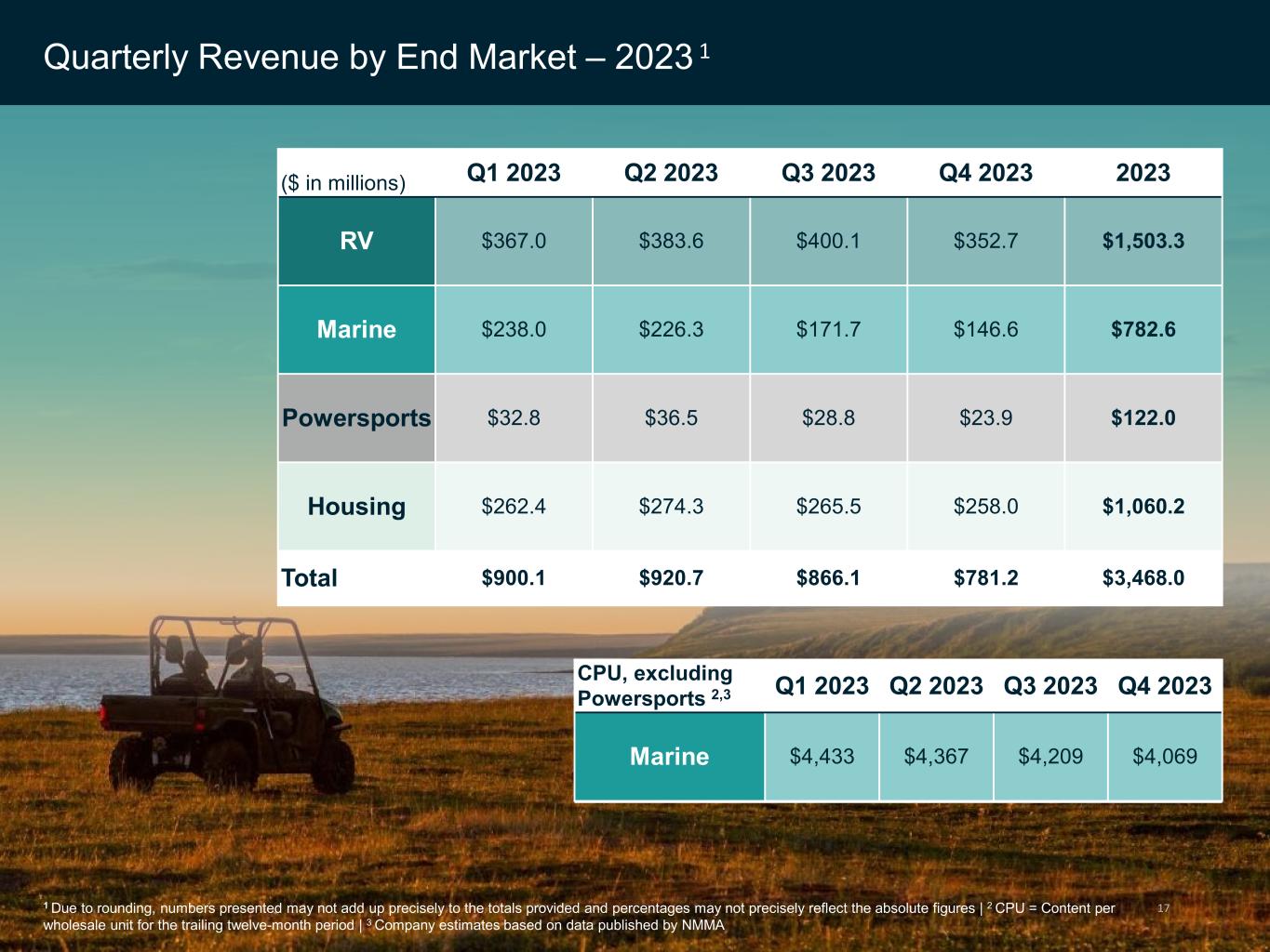 Quarterly Revenue by End Market – 2023 1 ($ in millions) Q1 2023 Q2 2023 Q3 2023 Q4 2023 2023 RV $367.0 $383.6 $400.1 $352.7 $1,503.3 Marine $238.0 $226.3 $171.7 $146.6 $782.6 Powersports $32.8 $36.5 $28.8 $23.9 $122.0 Housing $262.4 $274.3 $265.5 $258.0 $1,060.2 Total $900.1 $920.7 $866.1 $781.2 $3,468.0 17 CPU, excluding Powersports 2,3 Q1 2023 Q2 2023 Q3 2023 Q4 2023 Marine $4,433 $4,367 $4,209 $4,069 1 Due to rounding, numbers presented may not add up precisely to the totals provided and percentages may not precisely reflect the absolute figures | 2 CPU = Content per wholesale unit for the trailing twelve-month period | 3 Company estimates based on data published by NMMA