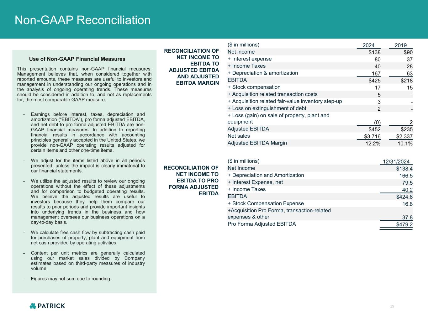 ($ in millions) 2024 2019 Net income $138 $90 + Interest expense 80 37 + Income Taxes 40 28 + Depreciation & amortization 167 63 EBITDA $425 $218 + Stock compensation 17 15 + Acquisition related transaction costs 5 - + Acquisition related fair-value inventory step-up 3 - + Loss on extinguishment of debt 2 - + Loss (gain) on sale of property, plant and equipment (0) 2 Adjusted EBITDA $452 $235 Net sales $3,716 $2,337 Adjusted EBITDA Margin 12.2% 10.1% Non-GAAP Reconciliation 19 RECONCILIATION OF NET INCOME TO EBITDA TO ADJUSTED EBITDA AND ADJUSTED EBITDA MARGIN RECONCILIATION OF NET INCOME TO EBITDA TO PRO FORMA ADJUSTED EBITDA ($ in millions) 12/31/2024 Net Income $138.4 + Depreciation and Amortization 166.5 + Interest Expense, net 79.5 + Income Taxes 40.2 EBITDA $424.6 + Stock Compensation Expense 16.8 +Acquisition Pro Forma, transaction-related expenses & other 37.8 Pro Forma Adjusted EBITDA $479.2 Use of Non-GAAP Financial Measures This presentation contains non-GAAP financial measures. Management believes that, when considered together with reported amounts, these measures are useful to investors and management in understanding our ongoing operations and in the analysis of ongoing operating trends. These measures should be considered in addition to, and not as replacements for, the most comparable GAAP measure. – Earnings before interest, taxes, depreciation and amortization (“EBITDA”), pro forma adjusted EBITDA, and net debt to pro forma adjusted EBITDA are non- GAAP financial measures. In addition to reporting financial results in accordance with accounting principles generally accepted in the United States, we provide non-GAAP operating results adjusted for certain items and other one-time items. – We adjust for the items listed above in all periods presented, unless the impact is clearly immaterial to our financial statements. – We utilize the adjusted results to review our ongoing operations without the effect of these adjustments and for comparison to budgeted operating results. We believe the adjusted results are useful to investors because they help them compare our results to prior periods and provide important insights into underlying trends in the business and how management oversees our business operations on a day-to-day basis. – We calculate free cash flow by subtracting cash paid for purchases of property, plant and equipment from net cash provided by operating activities. – Content per unit metrics are generally calculated using our market sales divided by Company estimates based on third-party measures of industry volume. – Figures may not sum due to rounding.