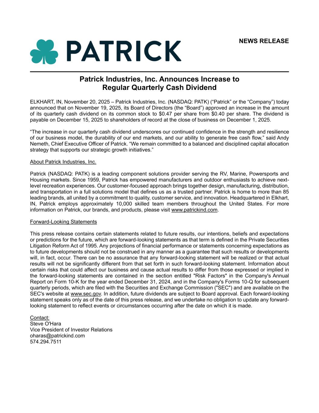 NEWS RELEASE Patrick Industries, Inc. Announces Increase to Regular Quarterly Cash Dividend ELKHART, IN, November 20, 2025 – Patrick Industries, Inc. (NASDAQ: PATK) (“Patrick” or the “Company”) today announced that on November 19, 2025, its Board of Directors (the “Board”) approved an increase in the amount of its quarterly cash dividend on its common stock to $0.47 per share from $0.40 per share. The dividend is payable on December 15, 2025 to shareholders of record at the close of business on December 1, 2025. “The increase in our quarterly cash dividend underscores our continued confidence in the strength and resilience of our business model, the durability of our end markets, and our ability to generate free cash flow,” said Andy Nemeth, Chief Executive Officer of Patrick. “We remain committed to a balanced and disciplined capital allocation strategy that supports our strategic growth initiatives.” About Patrick Industries, Inc. Patrick (NASDAQ: PATK) is a leading component solutions provider serving the RV, Marine, Powersports and Housing markets. Since 1959, Patrick has empowered manufacturers and outdoor enthusiasts to achieve next- level recreation experiences. Our customer-focused approach brings together design, manufacturing, distribution, and transportation in a full solutions model that defines us as a trusted partner. Patrick is home to more than 85 leading brands, all united by a commitment to quality, customer service, and innovation. Headquartered in Elkhart, IN, Patrick employs approximately 10,000 skilled team members throughout the United States. For more information on Patrick, our brands, and products, please visit www.patrickind.com. Forward-Looking Statements This press release contains certain statements related to future results, our intentions, beliefs and expectations or predictions for the future, which are forward-looking statements as that term is defined in the Private Securities Litigation Reform Act of 1995. Any projections of financial performance or statements concerning expectations as to future developments should not be construed in any manner as a guarantee that such results or developments will, in fact, occur. There can be no assurance that any forward-looking statement will be realized or that actual results will not be significantly different from that set forth in such forward-looking statement. Information about certain risks that could affect our business and cause actual results to differ from those expressed or implied in the forward-looking statements are contained in the section entitled "Risk Factors" in the Company's Annual Report on Form 10-K for the year ended December 31, 2024, and in the Company's Forms 10-Q for subsequent quarterly periods, which are filed with the Securities and Exchange Commission ("SEC") and are available on the SEC's website at www.sec.gov. In addition, future dividends are subject to Board approval. Each forward-looking statement speaks only as of the date of this press release, and we undertake no obligation to update any forward- looking statement to reflect events or circumstances occurring after the date on which it is made. Contact: Steve O'Hara Vice President of Investor Relations oharas@patrickind.com 574.294.7511