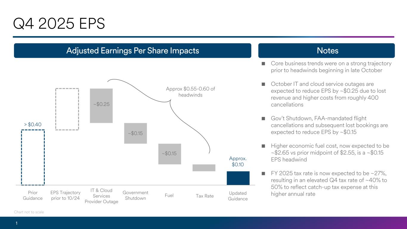 1 Q4 2025 EPS Adjusted Earnings Per Share Impacts Notes ■ Core business trends were on a strong trajectory prior to headwinds beginning in late October ■ October IT and cloud service outages are expected to reduce EPS by ~$0.25 due to lost revenue and higher costs from roughly 400 cancellations ■ Gov’t Shutdown, FAA-mandated flight cancellations and subsequent lost bookings are expected to reduce EPS by ~$0.15 ■ Higher economic fuel cost, now expected to be ~$2.65 vs prior midpoint of $2.55, is a ~$0.15 EPS headwind ■ FY 2025 tax rate is now expected to be ~27%, resulting in an elevated Q4 tax rate of ~40% to 50% to reflect catch-up tax expense at this higher annual rate Prior Guidance EPS Trajectory prior to 10/24 IT & Cloud Services Provider Outage Gov't Shutdown Fuel Tax Rate Updated Guidance > $0.40 ~$0.25 ~$0.15 ~$0.15 Chart not to scale Approx $0.55-0.60 of headwinds Approx. $0.10 Prior Guidance EPS Trajectory prior to 10/24 IT l ud Services Provider Outage Government Shutdown Fuel Tax Rate Updated Guidance