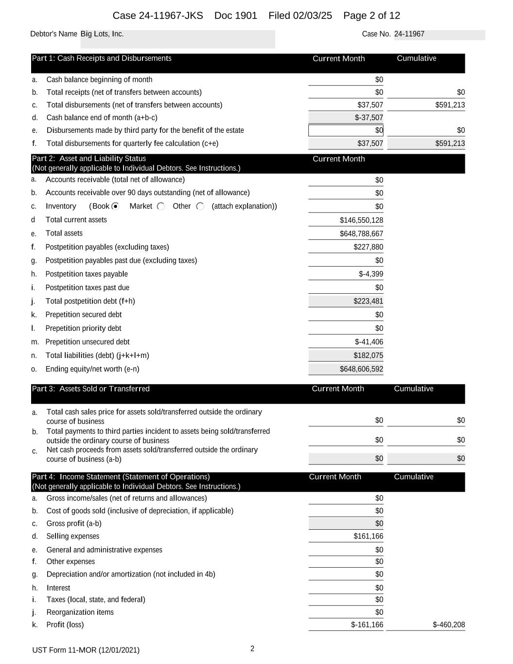 UST Form 11-MOR (12/01/2021) 2 Debtor's Name Big Lots, Inc. Case No. 24-11967 Part 1: Cash Receipts and Disbursements Current Month Cumulative a. Cash balance beginning of month $0 b. Total receipts (net of transfers between accounts) $0 $0 c. Total disbursements (net of transfers between accounts) $37,507 $591,213 d. Cash balance end of month (a+b-c) $-37,507 e. Disbursements made by third party for the benefit of the estate $0 $0 f. Total disbursements for quarterly fee calculation (c+e) $37,507 $591,213 Part 2: Asset and Liability Status Current Month (Not generally applicable to Individual Debtors. See Instructions.) a. Accounts receivable (total net of allowance) $0 b. Accounts receivable over 90 days outstanding (net of allowance) $0 c. Inventory ( (attach explanation))Book Market Other $0 d Total current assets $146,550,128 e. Total assets $648,788,667 f. Postpetition payables (excluding taxes) $227,880 g. Postpetition payables past due (excluding taxes) $0 h. Postpetition taxes payable $-4,399 i. Postpetition taxes past due $0 j. Total postpetition debt (f+h) $223,481 k. Prepetition secured debt $0 l. Prepetition priority debt $0 m. Prepetition unsecured debt $-41,406 n. Total liabilities (debt) (j+k+l+m) $182,075 o. Ending equity/net worth (e-n) $648,606,592 Part 3: Assets Sold or Transferred Current Month Cumulative a. Total cash sales price for assets sold/transferred outside the ordinary course of business $0 $0 b. Total payments to third parties incident to assets being sold/transferred outside the ordinary course of business $0 $0 c. Net cash proceeds from assets sold/transferred outside the ordinary course of business (a-b) $0 $0 Part 4: Income Statement (Statement of Operations) Current Month Cumulative (Not generally applicable to Individual Debtors. See Instructions.) a. Gross income/sales (net of returns and allowances) $0 b. Cost of goods sold (inclusive of depreciation, if applicable) $0 c. Gross profit (a-b) $0 d. Selling expenses $161,166 e. General and administrative expenses $0 f. Other expenses $0 g. Depreciation and/or amortization (not included in 4b) $0 h. Interest $0 i. Taxes (local, state, and federal) $0 j. Reorganization items $0 k. Profit (loss) $-161,166 $-460,208 Case 24-11967-JKS Doc 1901 Filed 02/03/25 Page 2 of 12