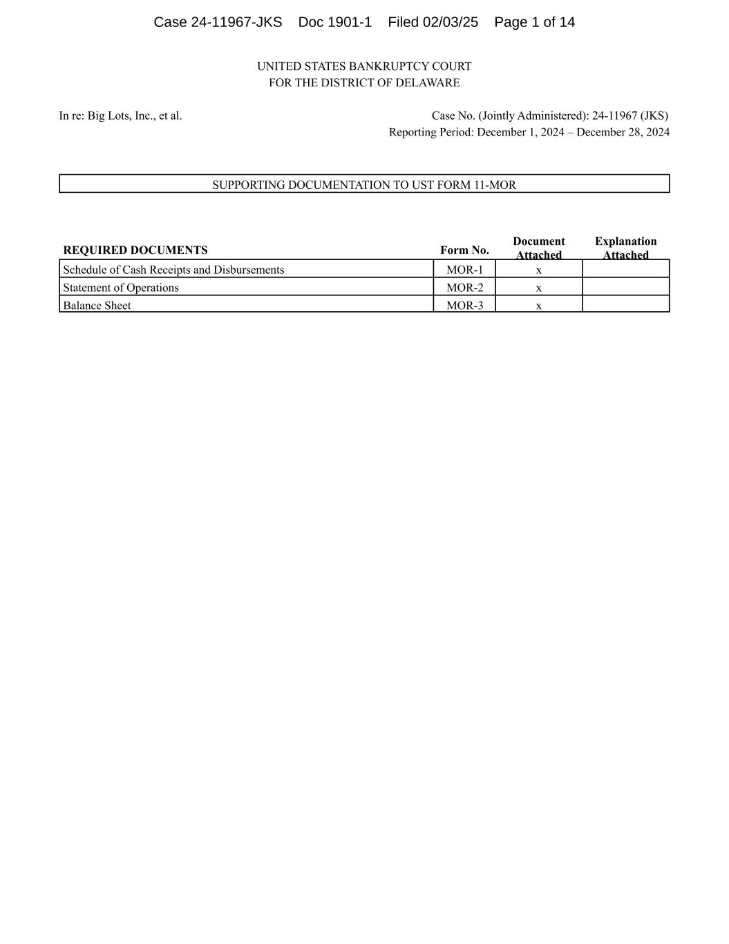 UNITED STATES BANKRUPTCY COURT FOR THE DISTRICT OF DELAWARE In re: Big Lots, Inc., et al. Case No. (Jointly Administered): 24-11967 (JKS) Reporting Period: December 1, 2024 – December 28, 2024 SUPPORTING DOCUMENTATION TO UST FORM 11-MOR REQUIRED DOCUMENTS Form No. Document Attached Explanation Attached Schedule of Cash Receipts and Disbursements MOR-1 x Statement of Operations MOR-2 x Balance Sheet MOR-3 x Case 24-11967-JKS Doc 1901-1 Filed 02/03/25 Page 1 of 14