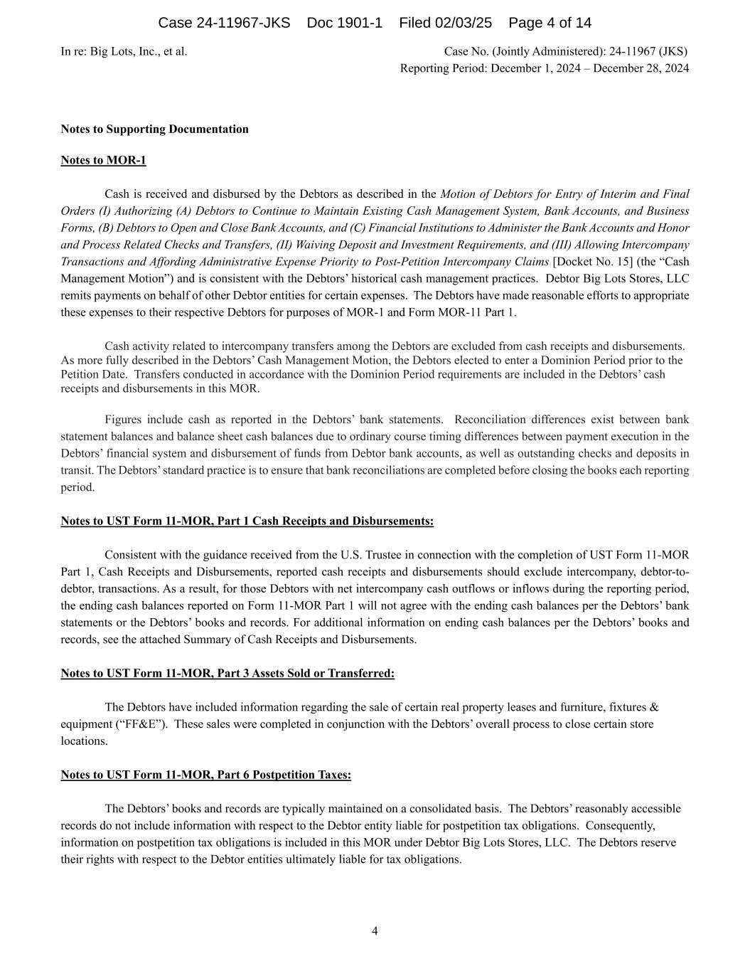 In re: Big Lots, Inc., et al. Case No. (Jointly Administered): 24-11967 (JKS) Reporting Period: December 1, 2024 – December 28, 2024 4 Notes to Supporting Documentation Notes to MOR-1 Cash is received and disbursed by the Debtors as described in the Motion of Debtors for Entry of Interim and Final Orders (I) Authorizing (A) Debtors to Continue to Maintain Existing Cash Management System, Bank Accounts, and Business Forms, (B) Debtors to Open and Close Bank Accounts, and (C) Financial Institutions to Administer the Bank Accounts and Honor and Process Related Checks and Transfers, (II) Waiving Deposit and Investment Requirements, and (III) Allowing Intercompany Transactions and Affording Administrative Expense Priority to Post-Petition Intercompany Claims [Docket No. 15] (the “Cash Management Motion”) and is consistent with the Debtors’ historical cash management practices. Debtor Big Lots Stores, LLC remits payments on behalf of other Debtor entities for certain expenses. The Debtors have made reasonable efforts to appropriate these expenses to their respective Debtors for purposes of MOR-1 and Form MOR-11 Part 1. Cash activity related to intercompany transfers among the Debtors are excluded from cash receipts and disbursements. As more fully described in the Debtors’ Cash Management Motion, the Debtors elected to enter a Dominion Period prior to the Petition Date. Transfers conducted in accordance with the Dominion Period requirements are included in the Debtors’ cash receipts and disbursements in this MOR. Figures include cash as reported in the Debtors’ bank statements. Reconciliation differences exist between bank statement balances and balance sheet cash balances due to ordinary course timing differences between payment execution in the Debtors’ financial system and disbursement of funds from Debtor bank accounts, as well as outstanding checks and deposits in transit. The Debtors’ standard practice is to ensure that bank reconciliations are completed before closing the books each reporting period. Notes to UST Form 11-MOR, Part 1 Cash Receipts and Disbursements: Consistent with the guidance received from the U.S. Trustee in connection with the completion of UST Form 11-MOR Part 1, Cash Receipts and Disbursements, reported cash receipts and disbursements should exclude intercompany, debtor-to- debtor, transactions. As a result, for those Debtors with net intercompany cash outflows or inflows during the reporting period, the ending cash balances reported on Form 11-MOR Part 1 will not agree with the ending cash balances per the Debtors’ bank statements or the Debtors’ books and records. For additional information on ending cash balances per the Debtors’ books and records, see the attached Summary of Cash Receipts and Disbursements. Notes to UST Form 11-MOR, Part 3 Assets Sold or Transferred: The Debtors have included information regarding the sale of certain real property leases and furniture, fixtures & equipment (“FF&E”). These sales were completed in conjunction with the Debtors’ overall process to close certain store locations. Notes to UST Form 11-MOR, Part 6 Postpetition Taxes: The Debtors’ books and records are typically maintained on a consolidated basis. The Debtors’ reasonably accessible records do not include information with respect to the Debtor entity liable for postpetition tax obligations. Consequently, information on postpetition tax obligations is included in this MOR under Debtor Big Lots Stores, LLC. The Debtors reserve their rights with respect to the Debtor entities ultimately liable for tax obligations. Case 24-11967-JKS Doc 1901-1 Filed 02/03/25 Page 4 of 14