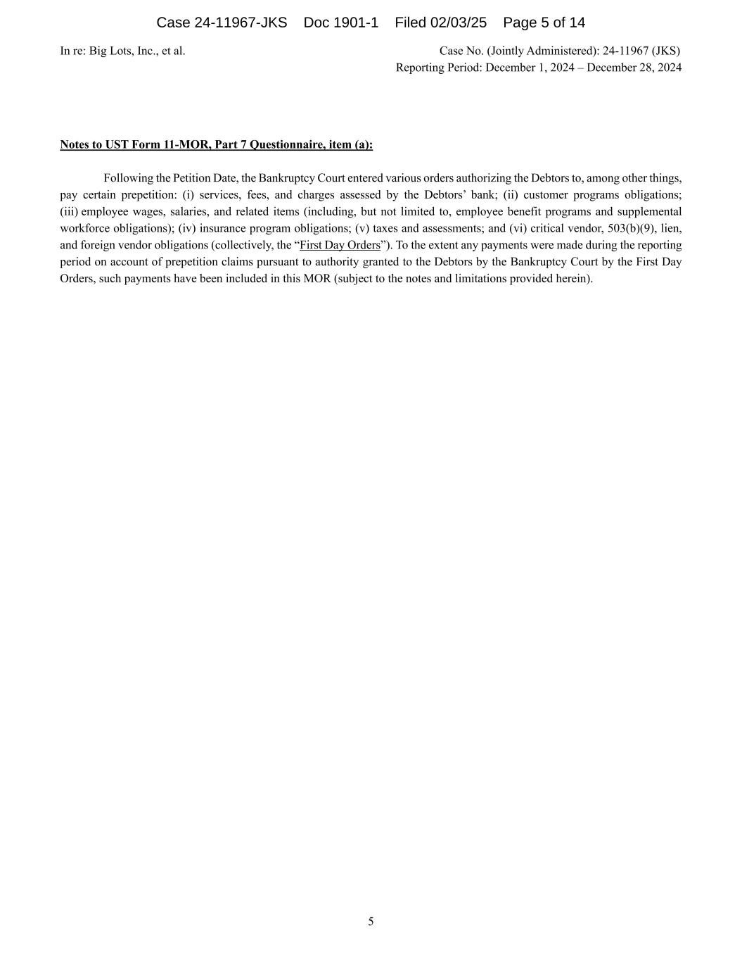In re: Big Lots, Inc., et al. Case No. (Jointly Administered): 24-11967 (JKS) Reporting Period: December 1, 2024 – December 28, 2024 5 Notes to UST Form 11-MOR, Part 7 Questionnaire, item (a): Following the Petition Date, the Bankruptcy Court entered various orders authorizing the Debtors to, among other things, pay certain prepetition: (i) services, fees, and charges assessed by the Debtors’ bank; (ii) customer programs obligations; (iii) employee wages, salaries, and related items (including, but not limited to, employee benefit programs and supplemental workforce obligations); (iv) insurance program obligations; (v) taxes and assessments; and (vi) critical vendor, 503(b)(9), lien, and foreign vendor obligations (collectively, the “First Day Orders”). To the extent any payments were made during the reporting period on account of prepetition claims pursuant to authority granted to the Debtors by the Bankruptcy Court by the First Day Orders, such payments have been included in this MOR (subject to the notes and limitations provided herein). Case 24-11967-JKS Doc 1901-1 Filed 02/03/25 Page 5 of 14