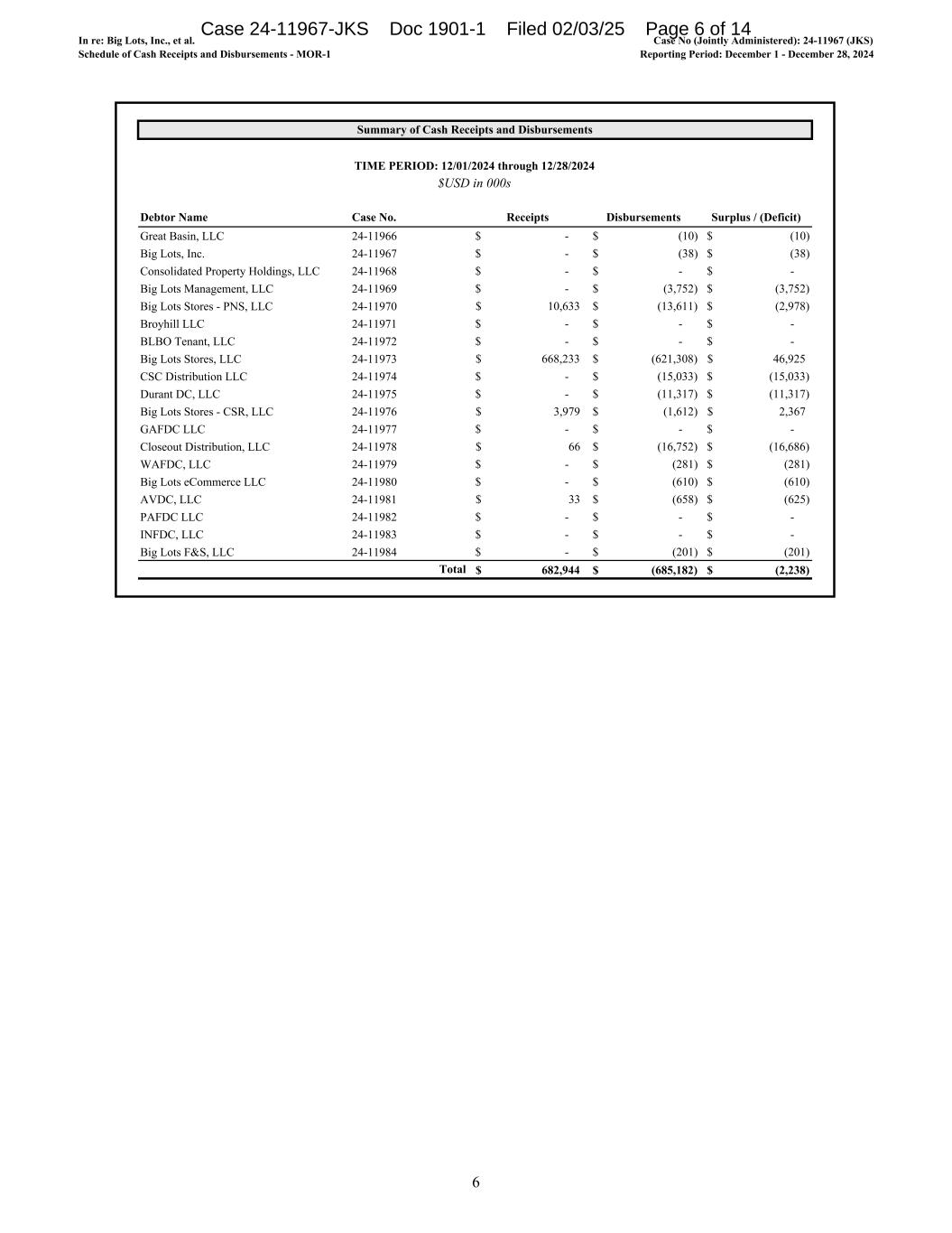 In re: Big Lots, Inc., et al. Schedule of Cash Receipts and Disbursements - MOR-1 Case No (Jointly Administered): 24-11967 (JKS) Reporting Period: December 1 - December 28, 2024 Summary of Cash Receipts and Disbursements TIME PERIOD: 12/01/2024 through 12/28/2024 Debtor Name Case No. Receipts Disbursements Surplus / (Deficit) Great Basin, LLC 24-11966 -$ (10)$ (10)$ Big Lots, Inc. 24-11967 -$ (38)$ (38)$ Consolidated Property Holdings, LLC 24-11968 -$ -$ -$ Big Lots Management, LLC 24-11969 -$ (3,752)$ (3,752)$ Big Lots Stores - PNS, LLC 24-11970 10,633$ (13,611)$ (2,978)$ Broyhill LLC 24-11971 -$ -$ -$ BLBO Tenant, LLC 24-11972 -$ -$ -$ Big Lots Stores, LLC 24-11973 668,233$ (621,308)$ 46,925$ CSC Distribution LLC 24-11974 -$ (15,033)$ (15,033)$ Durant DC, LLC 24-11975 -$ (11,317)$ (11,317)$ Big Lots Stores - CSR, LLC 24-11976 3,979$ (1,612)$ 2,367$ GAFDC LLC 24-11977 -$ -$ -$ Closeout Distribution, LLC 24-11978 66$ (16,752)$ (16,686)$ WAFDC, LLC 24-11979 -$ (281)$ (281)$ Big Lots eCommerce LLC 24-11980 -$ (610)$ (610)$ AVDC, LLC 24-11981 33$ (658)$ (625)$ PAFDC LLC 24-11982 -$ -$ -$ INFDC, LLC 24-11983 -$ -$ -$ Big Lots F&S, LLC 24-11984 -$ (201)$ (201)$ Total 682,944$ (685,182)$ (2,238)$ $USD in 000s 6 Case 24-11967-JKS Doc 1901-1 Filed 02/03/25 Page 6 of 14