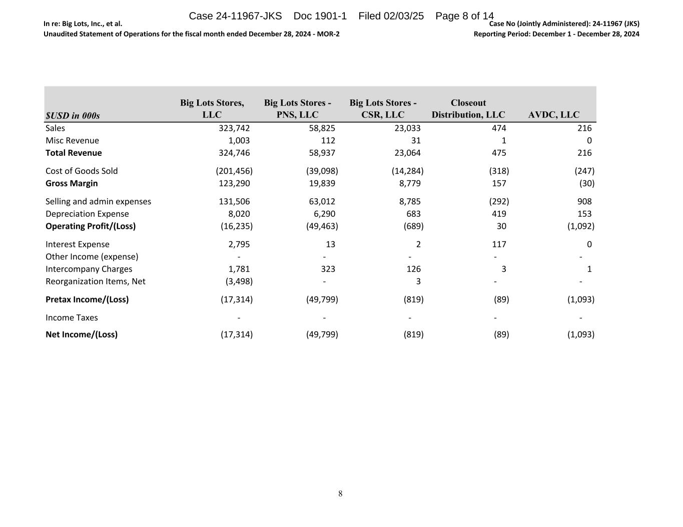 In re: Big Lots, Inc., et al. Unaudited Statement of Operations for the fiscal month ended December 28, 2024 - MOR-2 Case No (Jointly Administered): 24-11967 (JKS) Reporting Period: December 1 - December 28, 2024 $USD in 000s Big Lots Stores, LLC Big Lots Stores - PNS, LLC Big Lots Stores - CSR, LLC Closeout Distribution, LLC AVDC, LLC Sales 323,742 58,825 23,033 474 216 Misc Revenue 1,003 112 31 1 0 Total Revenue 324,746 58,937 23,064 475 216 Cost of Goods Sold (201,456) (39,098) (14,284) (318) (247) Gross Margin 123,290 19,839 8,779 157 (30) Selling and admin expenses 131,506 63,012 8,785 (292) 908 Depreciation Expense 8,020 6,290 683 419 153 Operating Profit/(Loss) (16,235) (49,463) (689) 30 (1,092) Interest Expense 2,795 13 2 117 0 Other Income (expense) - - - - - Intercompany Charges 1,781 323 126 3 1 Reorganization Items, Net (3,498) - 3 - - Pretax Income/(Loss) (17,314) (49,799) (819) (89) (1,093) Income Taxes - - - - - Net Income/(Loss) (17,314) (49,799) (819) (89) (1,093) 8 Case 24-11967-JKS Doc 1901-1 Filed 02/03/25 Page 8 of 14