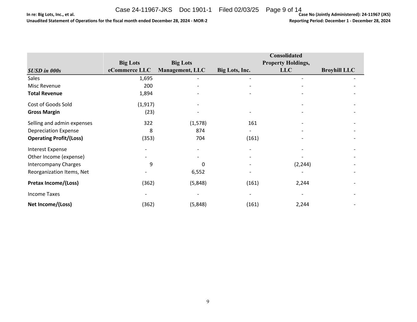 In re: Big Lots, Inc., et al. Unaudited Statement of Operations for the fiscal month ended December 28, 2024 - MOR-2 Case No (Jointly Administered): 24-11967 (JKS) Reporting Period: December 1 - December 28, 2024 $USD in 000s Sales Misc Revenue Total Revenue Cost of Goods Sold Gross Margin Selling and admin expenses Depreciation Expense Operating Profit/(Loss) Interest Expense Other Income (expense) Intercompany Charges Reorganization Items, Net Pretax Income/(Loss) Income Taxes Net Income/(Loss) Big Lots eCommerce LLC Big Lots Management, LLC Big Lots, Inc. Consolidated Property Holdings, LLC Broyhill LLC 1,695 - - - - 200 - - - - 1,894 - - - - (1,917) - - - (23) - - - - 322 (1,578) 161 - - 8 874 - - - (353) 704 (161) - - - - - - - - - - - - 9 0 - (2,244) - - 6,552 - - - (362) (5,848) (161) 2,244 - - - - - - (362) (5,848) (161) 2,244 - 9 Case 24-11967-JKS Doc 1901-1 Filed 02/03/25 Page 9 of 14