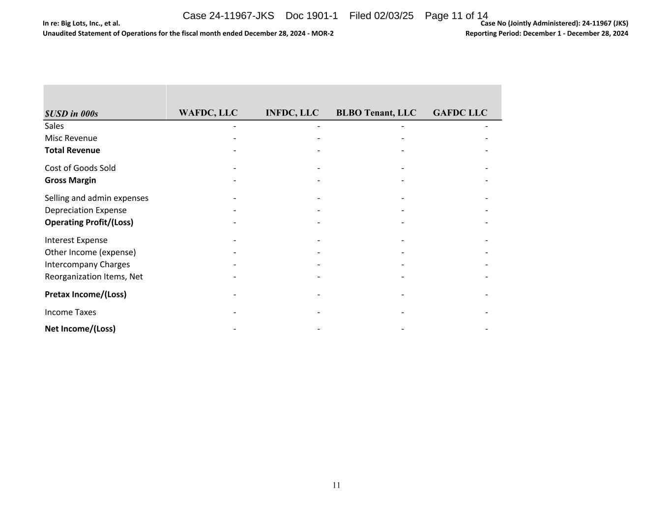 In re: Big Lots, Inc., et al. Unaudited Statement of Operations for the fiscal month ended December 28, 2024 - MOR-2 Case No (Jointly Administered): 24-11967 (JKS) Reporting Period: December 1 - December 28, 2024 $USD in 000s Sales Misc Revenue Total Revenue Cost of Goods Sold Gross Margin Selling and admin expenses Depreciation Expense Operating Profit/(Loss) Interest Expense Other Income (expense) Intercompany Charges Reorganization Items, Net Pretax Income/(Loss) Income Taxes Net Income/(Loss) WAFDC, LLC INFDC, LLC BLBO Tenant, LLC GAFDC LLC - - - - - - - - - - - - - - - - - - - - - - - - - - - - - - - - - - - - - - - - - - - - - - - - - - - - - - - - - - - - 11 Case 24-11967-JKS Doc 1901-1 Filed 02/03/25 Page 11 of 14