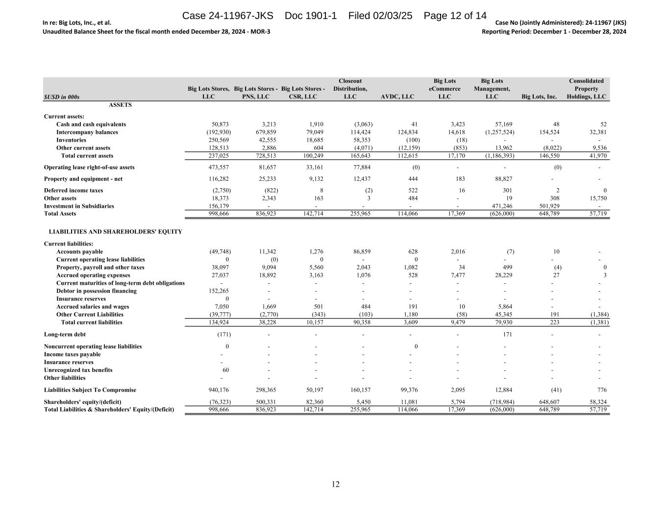 In re: Big Lots, Inc., et al. Unaudited Balance Sheet for the fiscal month ended December 28, 2024 - MOR-3 Case No (Jointly Administered): 24-11967 (JKS) Reporting Period: December 1 - December 28, 2024 $USD in 000s Big Lots Stores, LLC Big Lots Stores - PNS, LLC Big Lots Stores - CSR, LLC Closeout Distribution, LLC AVDC, LLC Big Lots eCommerce LLC Big Lots Management, LLC Big Lots, Inc. Consolidated Property Holdings, LLC ASSETS Current assets: Cash and cash equivalents 50,873 3,213 1,910 (3,063) 41 3,423 57,169 48 52 Intercompany balances (192,930) 679,859 79,049 114,424 124,834 14,618 (1,257,524) 154,524 32,381 Inventories 250,569 42,555 18,685 58,353 (100) (18) - - - Other current assets 128,513 2,886 604 (4,071) (12,159) (853) 13,962 (8,022) 9,536 Total current assets 237,025 728,513 100,249 165,643 112,615 17,170 (1,186,393) 146,550 41,970 Operating lease right-of-use assets 473,557 81,657 33,161 77,884 (0) - - (0) - Property and equipment - net 116,282 25,233 9,132 12,437 444 183 88,827 - - Deferred income taxes (2,750) (822) 8 (2) 522 16 301 2 0 Other assets 18,373 2,343 163 3 484 - 19 308 15,750 Investment in Subsidiaries 156,179 - - - - - 471,246 501,929 - Total Assets 998,666 836,923 142,714 255,965 114,066 17,369 (626,000) 648,789 57,719 LIABILITIES AND SHAREHOLDERS' EQUITY Current liabilities: Accounts payable (49,748) 11,342 1,276 86,859 628 2,016 (7) 10 - Current operating lease liabilities 0 (0) 0 - 0 - - - - Property, payroll and other taxes 38,097 9,094 5,560 2,043 1,082 34 499 (4) 0 Accrued operating expenses 27,037 18,892 3,163 1,076 528 7,477 28,229 27 3 Current maturities of long-term debt obligations - - - - - - - - - Debtor in possession financing 152,265 - - - - - - - - Insurance reserves 0 - - - - - - - - Accrued salaries and wages 7,050 1,669 501 484 191 10 5,864 - - Other Current Liabilities (39,777) (2,770) (343) (103) 1,180 (58) 45,345 191 (1,384) Total current liabilities 134,924 38,228 10,157 90,358 3,609 9,479 79,930 223 (1,381) Long-term debt (171) - - - - - 171 - - Noncurrent operating lease liabilities 0 - - - 0 - - - - Income taxes payable - - - - - - - - - Insurance reserves - - - - - - - - - Unrecognized tax benefits 60 - - - - - - - - Other liabilities - - - - - - - - - Liabilities Subject To Compromise 940,176 298,365 50,197 160,157 99,376 2,095 12,884 (41) 776 Shareholders' equity/(deficit) (76,323) 500,331 82,360 5,450 11,081 5,794 (718,984) 648,607 58,324 Total Liabilities & Shareholders' Equity/(Deficit) 998,666 836,923 142,714 255,965 114,066 17,369 (626,000) 648,789 57,719 12 Case 24-11967-JKS Doc 1901-1 Filed 02/03/25 Page 12 of 14