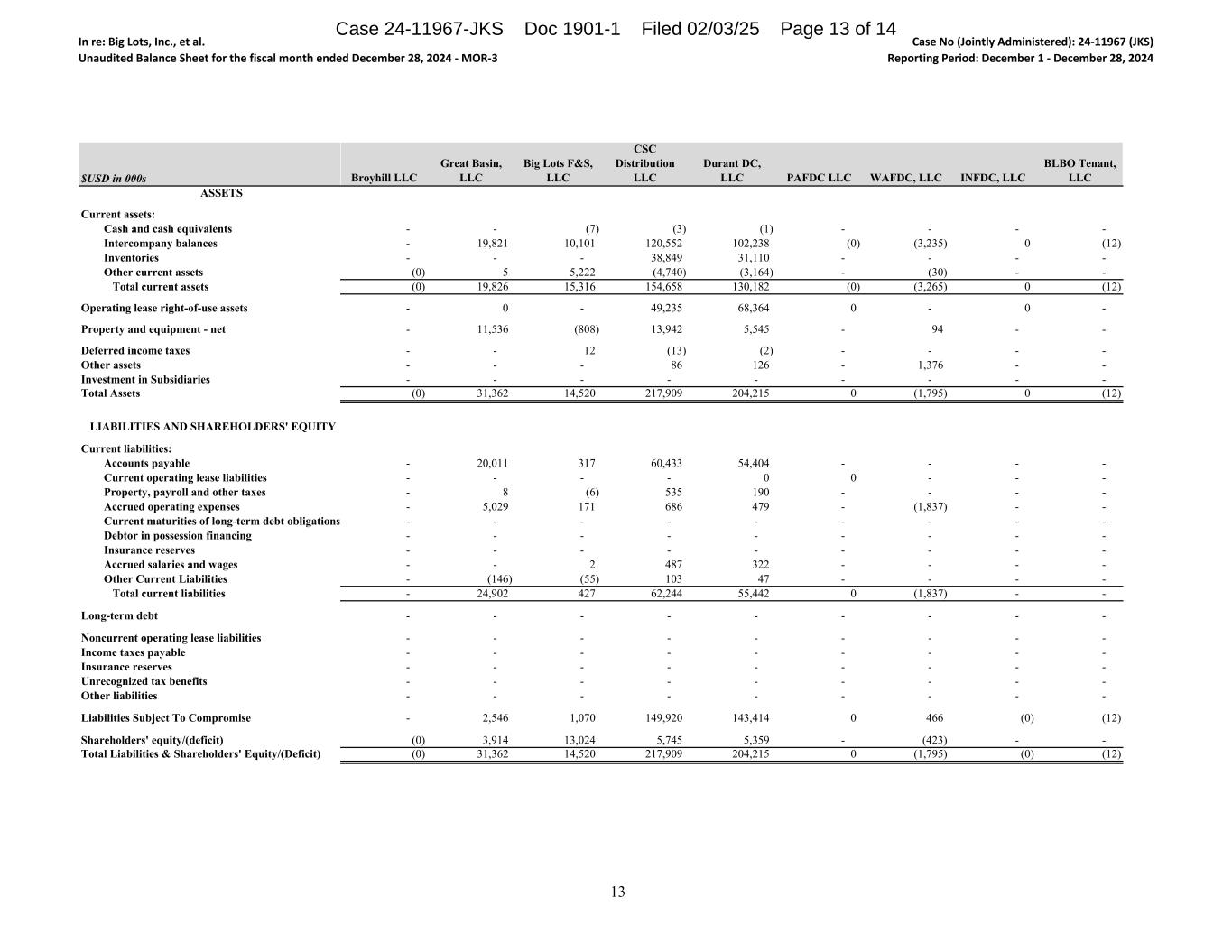 In re: Big Lots, Inc., et al. Unaudited Balance Sheet for the fiscal month ended December 28, 2024 - MOR-3 Case No (Jointly Administered): 24-11967 (JKS) Reporting Period: December 1 - December 28, 2024 $USD in 000s ASSETS Current assets: Cash and cash equivalents Intercompany balances Inventories Other current assets Total current assets Operating lease right-of-use assets Property and equipment - net Deferred income taxes Other assets Investment in Subsidiaries Total Assets LIABILITIES AND SHAREHOLDERS' EQUITY Current liabilities: Accounts payable Current operating lease liabilities Property, payroll and other taxes Accrued operating expenses Current maturities of long-term debt obligations Debtor in possession financing Insurance reserves Accrued salaries and wages Other Current Liabilities Total current liabilities Long-term debt Noncurrent operating lease liabilities Income taxes payable Insurance reserves Unrecognized tax benefits Other liabilities Liabilities Subject To Compromise Shareholders' equity/(deficit) Total Liabilities & Shareholders' Equity/(Deficit) Broyhill LLC Great Basin, LLC Big Lots F&S, LLC CSC Distribution LLC Durant DC, LLC PAFDC LLC WAFDC, LLC INFDC, LLC BLBO Tenant, LLC - - (7) (3) (1) - - - - - 19,821 10,101 120,552 102,238 (0) (3,235) 0 (12) - - - 38,849 31,110 - - - - (0) 5 5,222 (4,740) (3,164) - (30) - - (0) 19,826 15,316 154,658 130,182 (0) (3,265) 0 (12) - 0 - 49,235 68,364 0 - 0 - - 11,536 (808) 13,942 5,545 - 94 - - - - 12 (13) (2) - - - - - - - 86 126 - 1,376 - - - - - - - - - - - (0) 31,362 14,520 217,909 204,215 0 (1,795) 0 (12) - 20,011 317 60,433 54,404 - - - - - - - - 0 0 - - - - 8 (6) 535 190 - - - - - 5,029 171 686 479 - (1,837) - - - - - - - - - - - - - - - - - - - - - - - - - - - - - - - 2 487 322 - - - - - (146) (55) 103 47 - - - - - 24,902 427 62,244 55,442 0 (1,837) - - - - - - - - - - - - - - - - - - - - - - - - - - - - - - - - - - - - - - - - - - - - - - - - - - - - - - - - - 2,546 1,070 149,920 143,414 0 466 (0) (12) (0) 3,914 13,024 5,745 5,359 - (423) - - (0) 31,362 14,520 217,909 204,215 0 (1,795) (0) (12) 13 Case 24-11967-JKS Doc 1901-1 Filed 02/03/25 Page 13 of 14