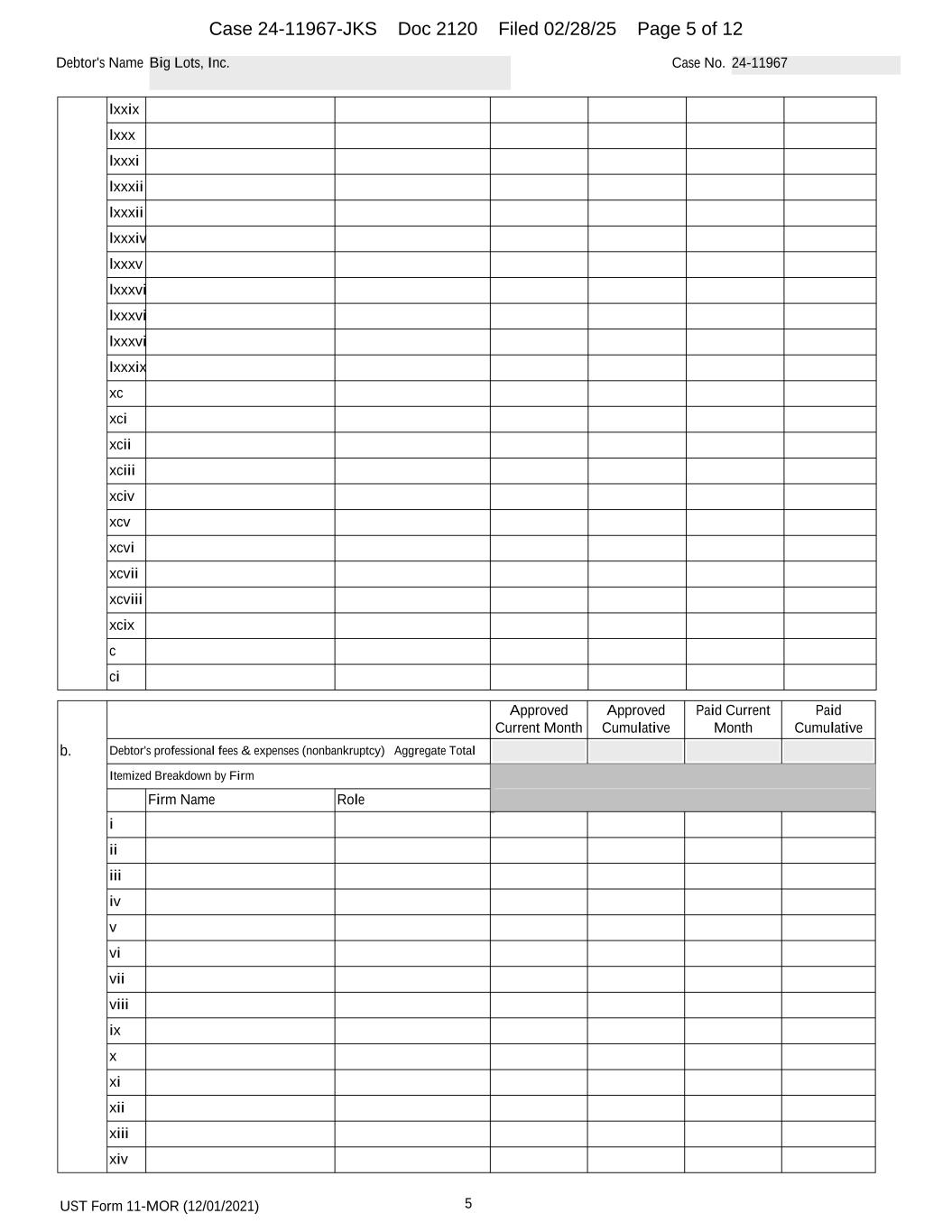 UST Form 11-MOR (12/01/2021) 5 Debtor's Name Big Lots, Inc. Case No. 24-11967 lxxix lxxx lxxxi lxxxii lxxxii lxxxiv lxxxv lxxxvi lxxxvi lxxxvi lxxxix xc xci xcii xciii xciv xcv xcvi xcvii xcviii xcix c ci Approved Current Month Approved Cumulative Paid Current Month Paid Cumulative b. Debtor's professional fees & expenses (nonbankruptcy) Aggregate Total Itemized Breakdown by Firm Firm Name Role i ii iii iv v vi vii viii ix x xi xii xiii xiv Case 24-11967-JKS Doc 2120 Filed 02/28/25 Page 5 of 12