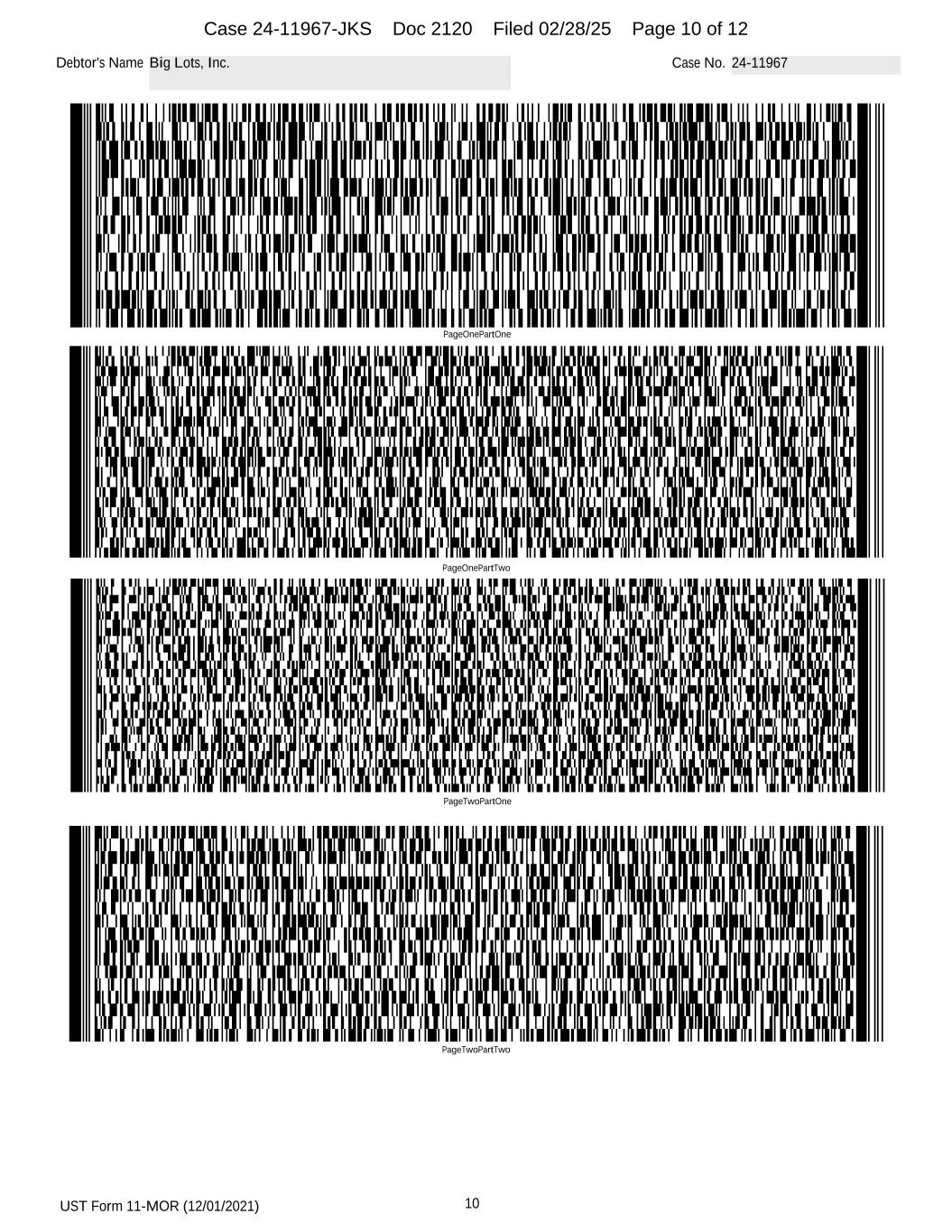 UST Form 11-MOR (12/01/2021) 10 Debtor's Name Big Lots, Inc. Case No. 24-11967 PageOnePartOne PageOnePartTwo PageTwoPartOne PageTwoPartTwo Case 24-11967-JKS Doc 2120 Filed 02/28/25 Page 10 of 12